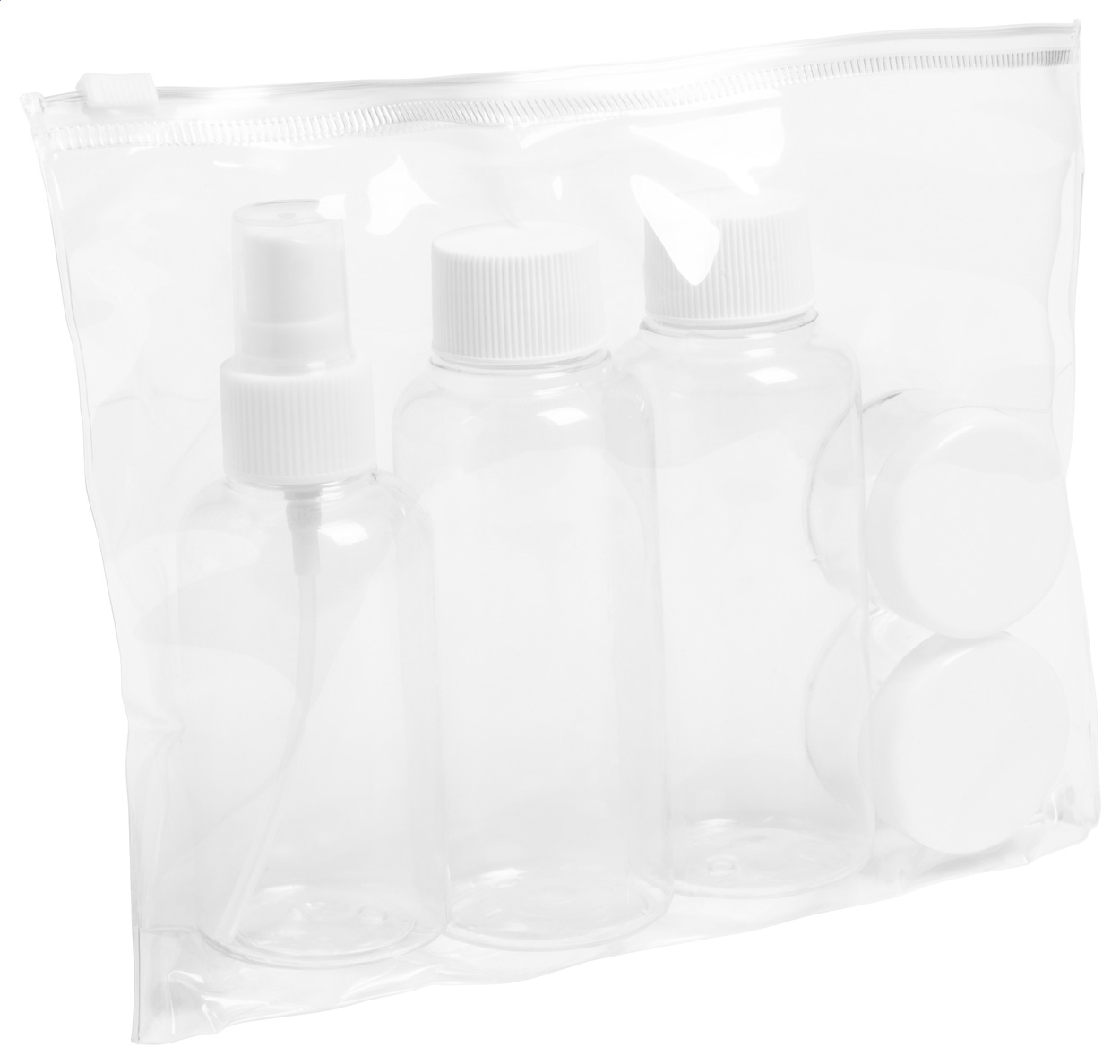 Transparentní PVC kosmetická taštička s 5 nádobkami do letadla.