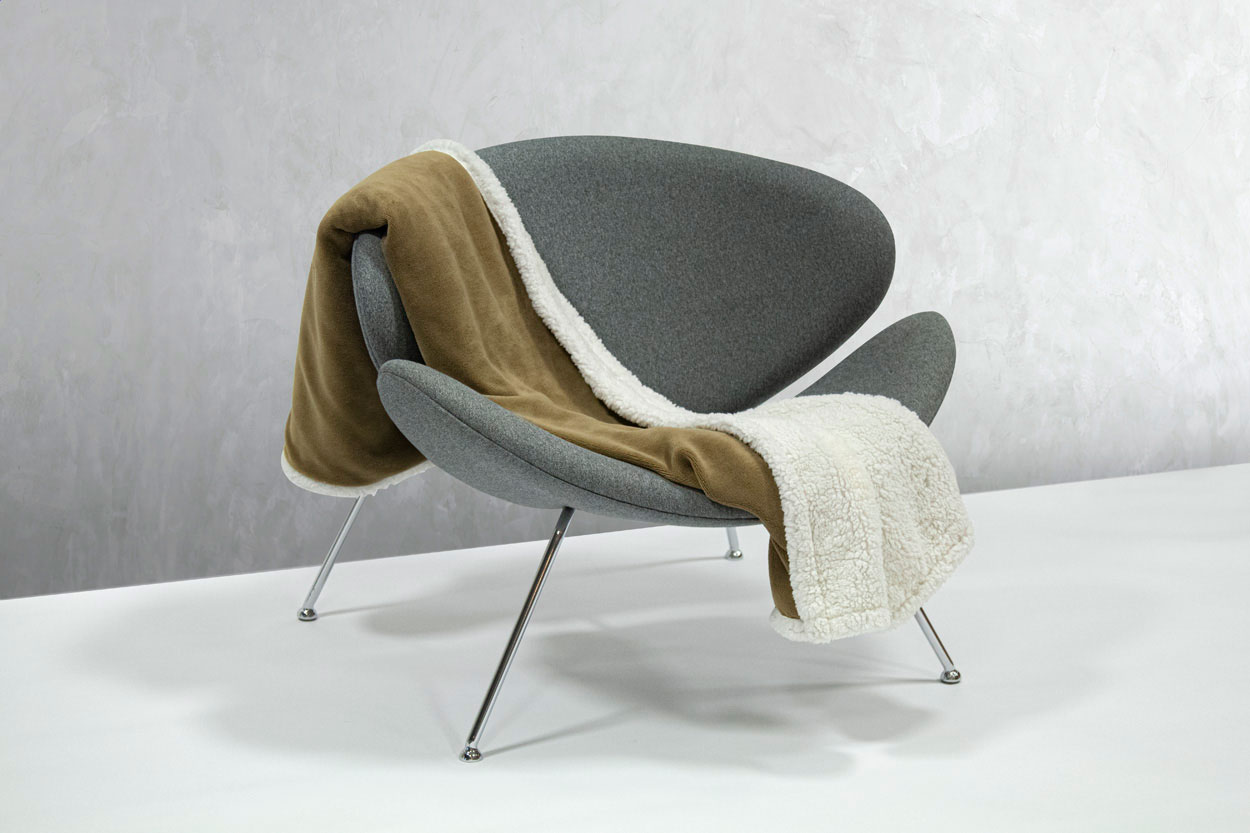 Dvouvrstvá fleecová přikrývka z materiálu coral fleece (200 g/m2) s oboustrannou podšívkou z sherpa fleecu (210 g/m2). Převázaná stuhou s papírovou etiketou na potisk.