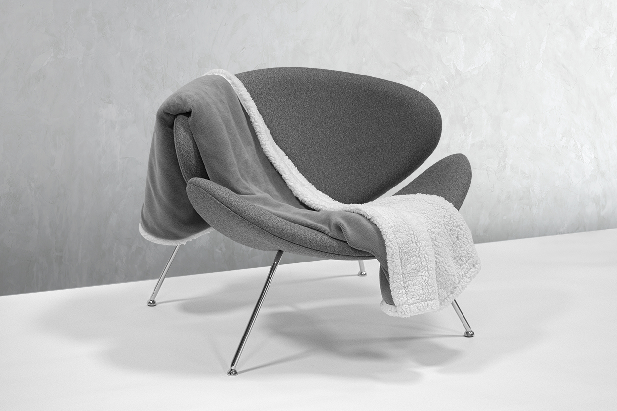 Dvouvrstvá fleecová přikrývka z materiálu coral fleece (200 g/m2) s oboustrannou podšívkou z sherpa fleecu (210 g/m2). Převázaná stuhou s papírovou etiketou na potisk.