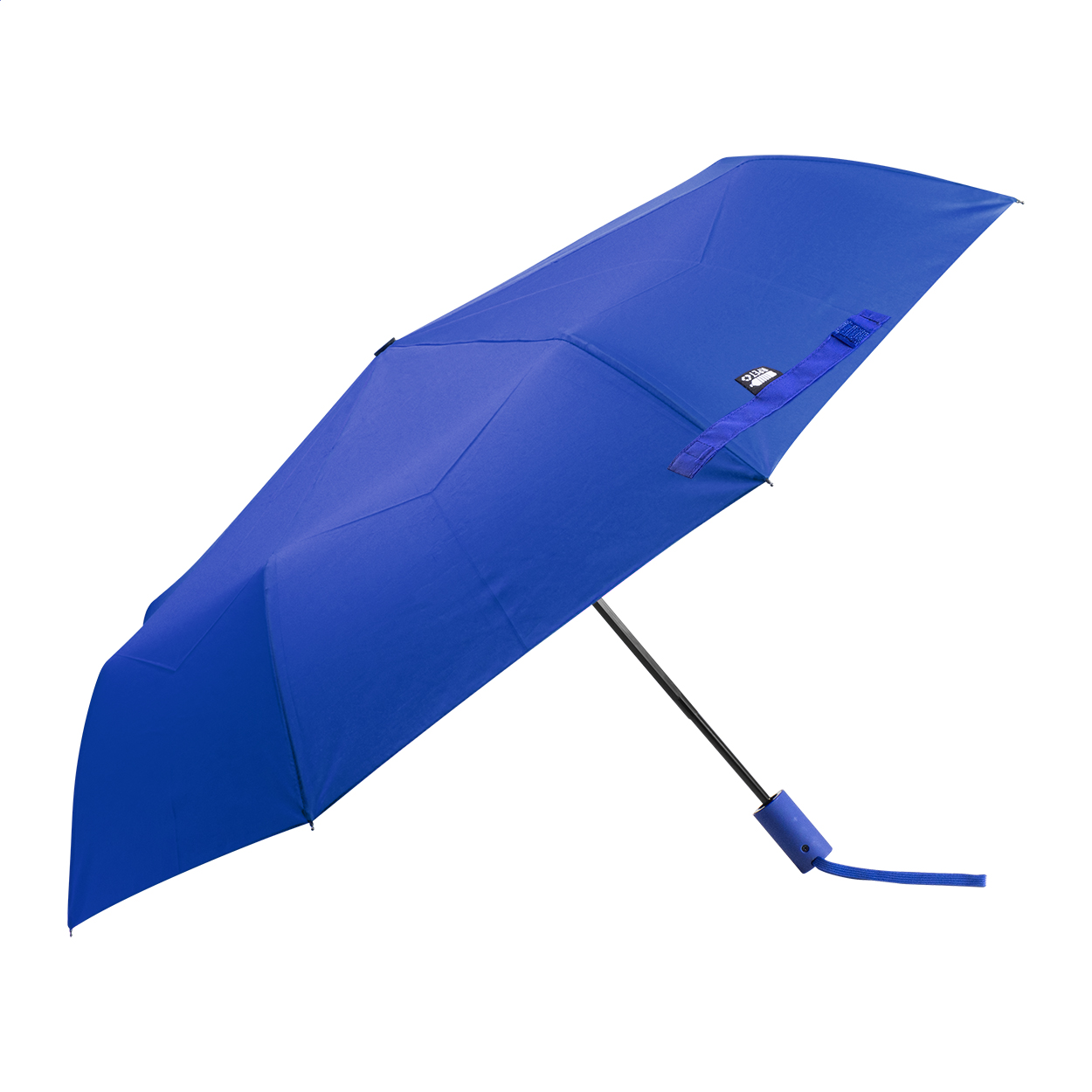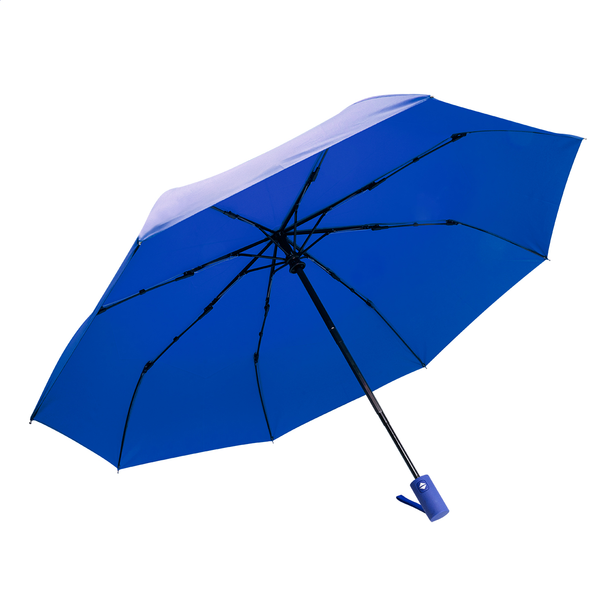 Plně automatický (otevřít/zavřít), větruodolný skládací deštník s 8 panely v pouzdře ve stejné barvě. S kovovým rámem, sklolaminátovými žebry a pogumovanou rukojetí. Pongee 190T RPET. S výrazným štítkem RPET.