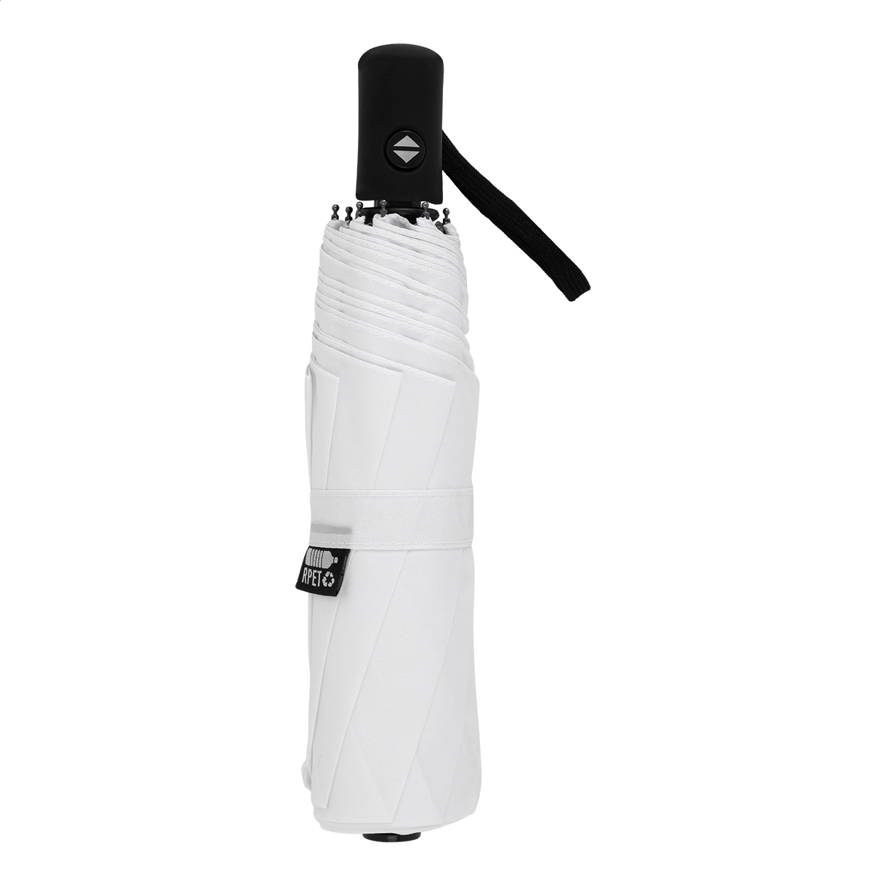 Plně automatický (otevřít/zavřít), větruodolný skládací deštník s 8 panely v pouzdře v odpovídající barvě. S kovovým rámem, sklolaminátovými žebry a pogumovanou rukojetí s poutkem na ruku. Pongee 190T RPET. S výrazným štítkem RPET.