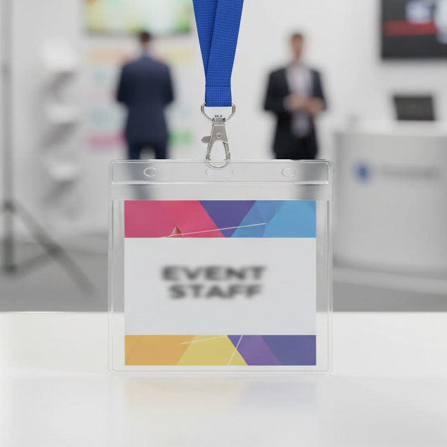 Držák jmenovky z PVC. Tento držák má otvor, který umožňuje připnutí karabiny