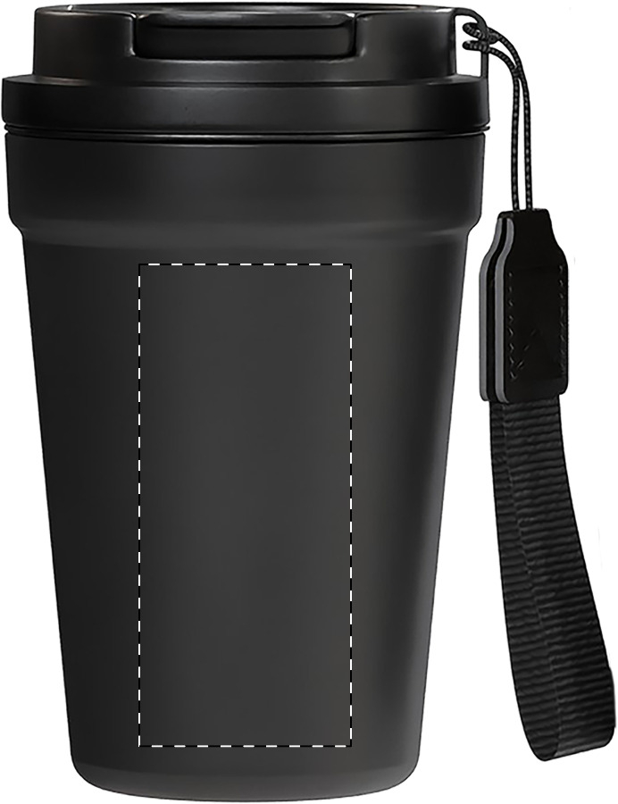 Využívá praktické víčko s otvorem na pití a látkové poutko z recyklovaného materiálu pro pohodlné nošení. Objem 400 ml v nadčasové černé barvě se hodí do kanceláře i na procházky krajinou.