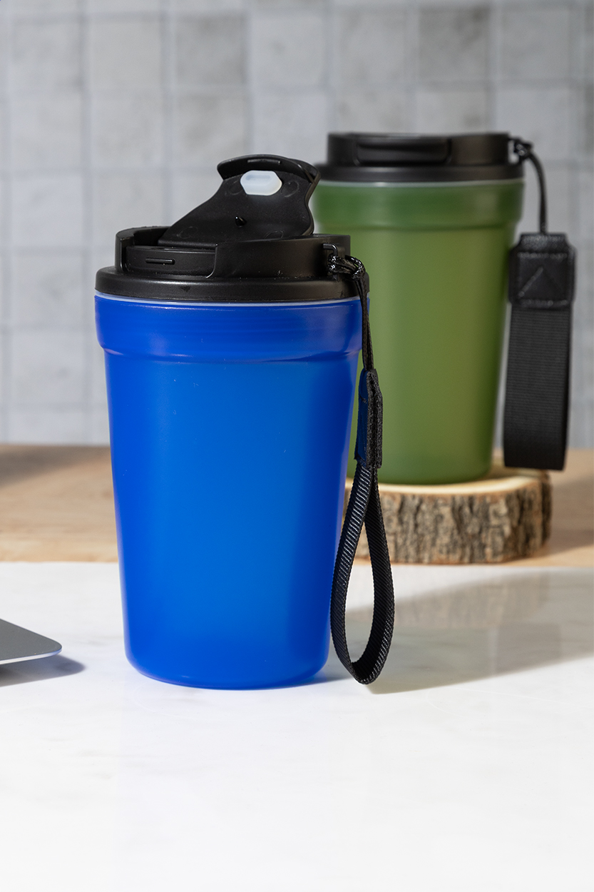 Jednostěnný cestovní kelímek z PP plastu s matnou povrchovou úpravou, víčkem na pití a poutkem z RPET polyesteru. 400 ml.
