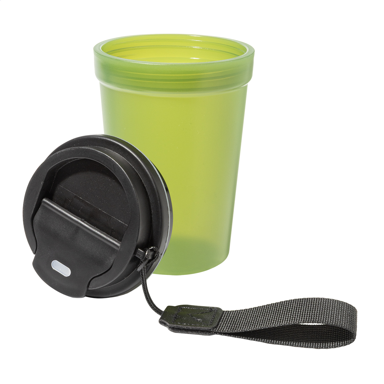 Jednostěnný cestovní kelímek z PP plastu s matnou povrchovou úpravou, víčkem na pití a poutkem z RPET polyesteru. 400 ml.