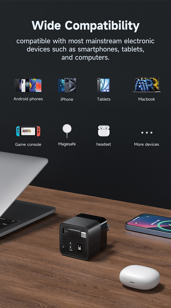 Využívá moderní technologii nitridu galia pro vyšší efektivitu a minimální zahřívání při zachování kompaktních rozměrů. Umožňuje nabíjet až tři zařízení současně a zastane roli univerzálního cestovního adaptéru.