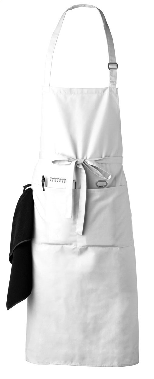 Barevná zástěra s předními kapsami a zavazováním v pase. Materiál 80 % polyester, 20 % bavlna.