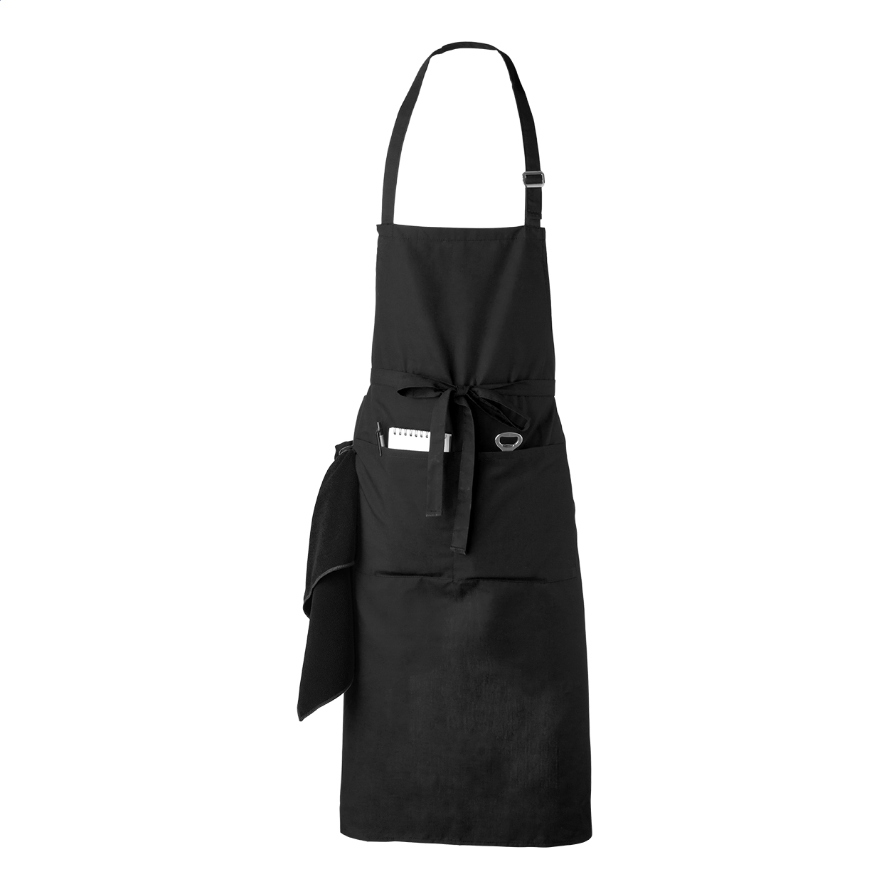 Barevná zástěra s předními kapsami a zavazováním v pase. Materiál 80 % polyester, 20 % bavlna.