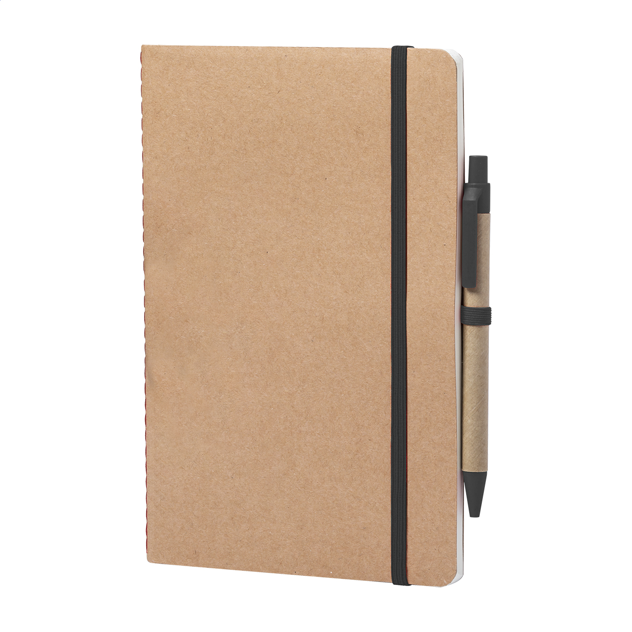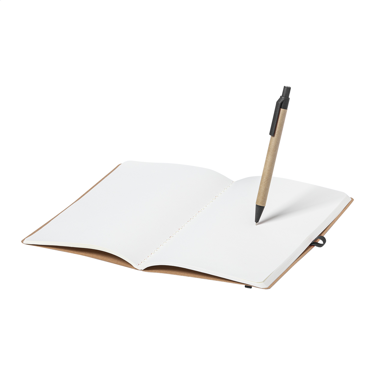 Zápisník formátu A5 z recyklovaného kartonu s 60 prázdnými listy a barevnou gumičkou na zavírání. Včetně kuličkového pera z plastu a pšeničné slámy. Modrá náplň.