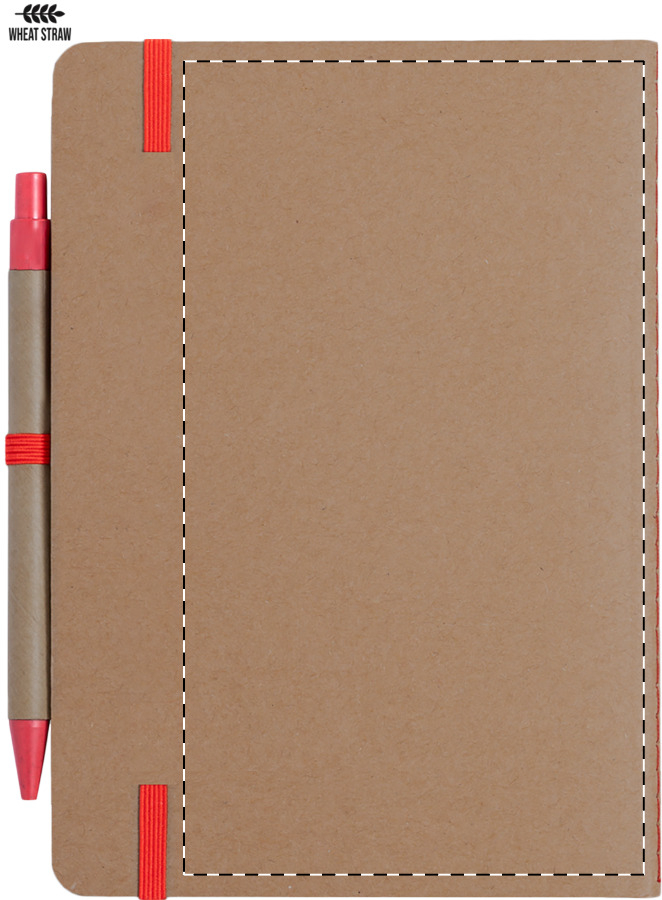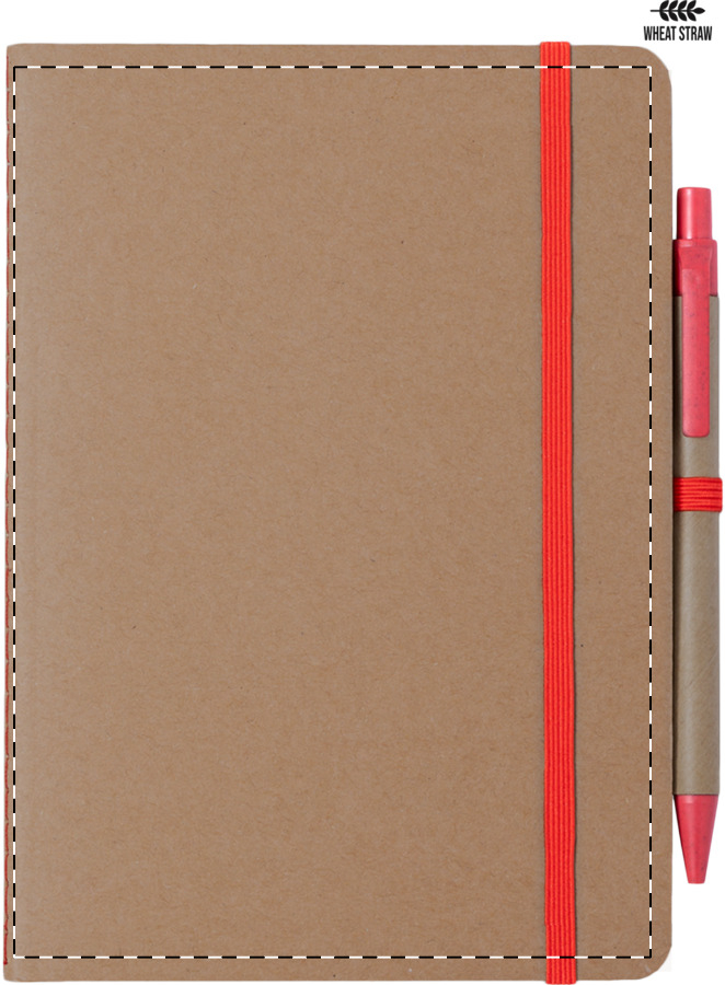 Zápisník formátu A5 z recyklovaného kartonu s 60 prázdnými listy a barevnou gumičkou na zavírání. Včetně kuličkového pera z plastu a pšeničné slámy. Modrá náplň.