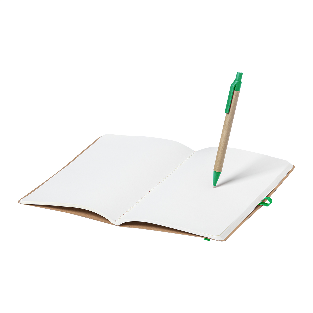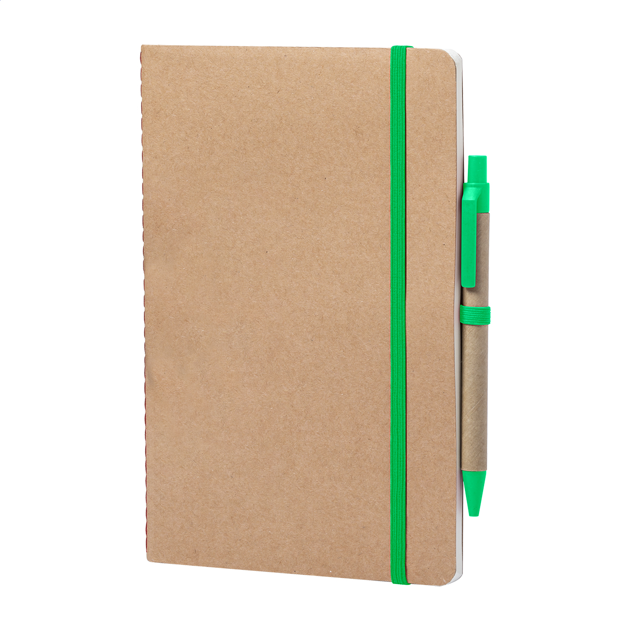 Zápisník formátu A5 z recyklovaného kartonu s 60 prázdnými listy a barevnou gumičkou na zavírání. Včetně kuličkového pera z plastu a pšeničné slámy. Modrá náplň.