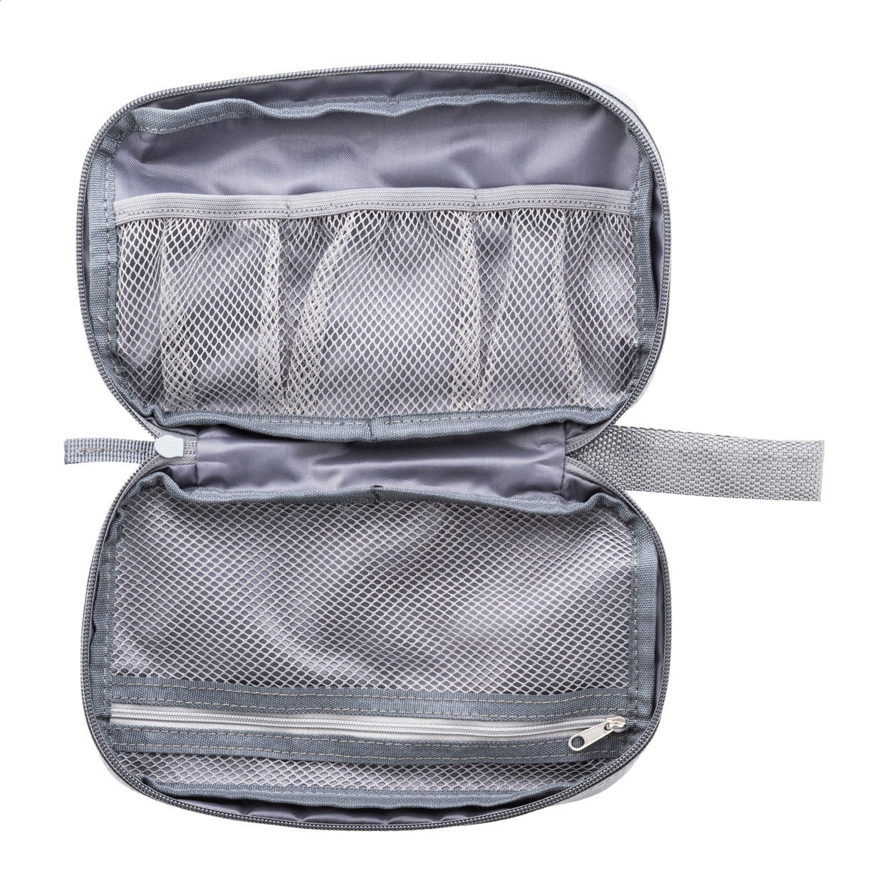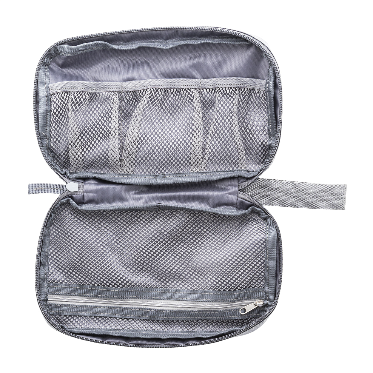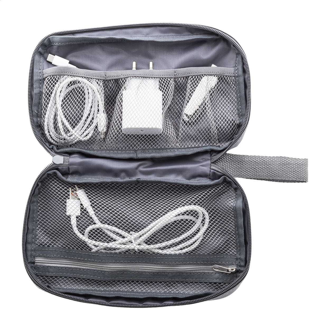 Pouzdro na organizér kabelů RPET na zip s vnitřními přihrádkami ze síťoviny a přední kapsou na zip. 600D RPET polyester s výrazným štítkem RPET.