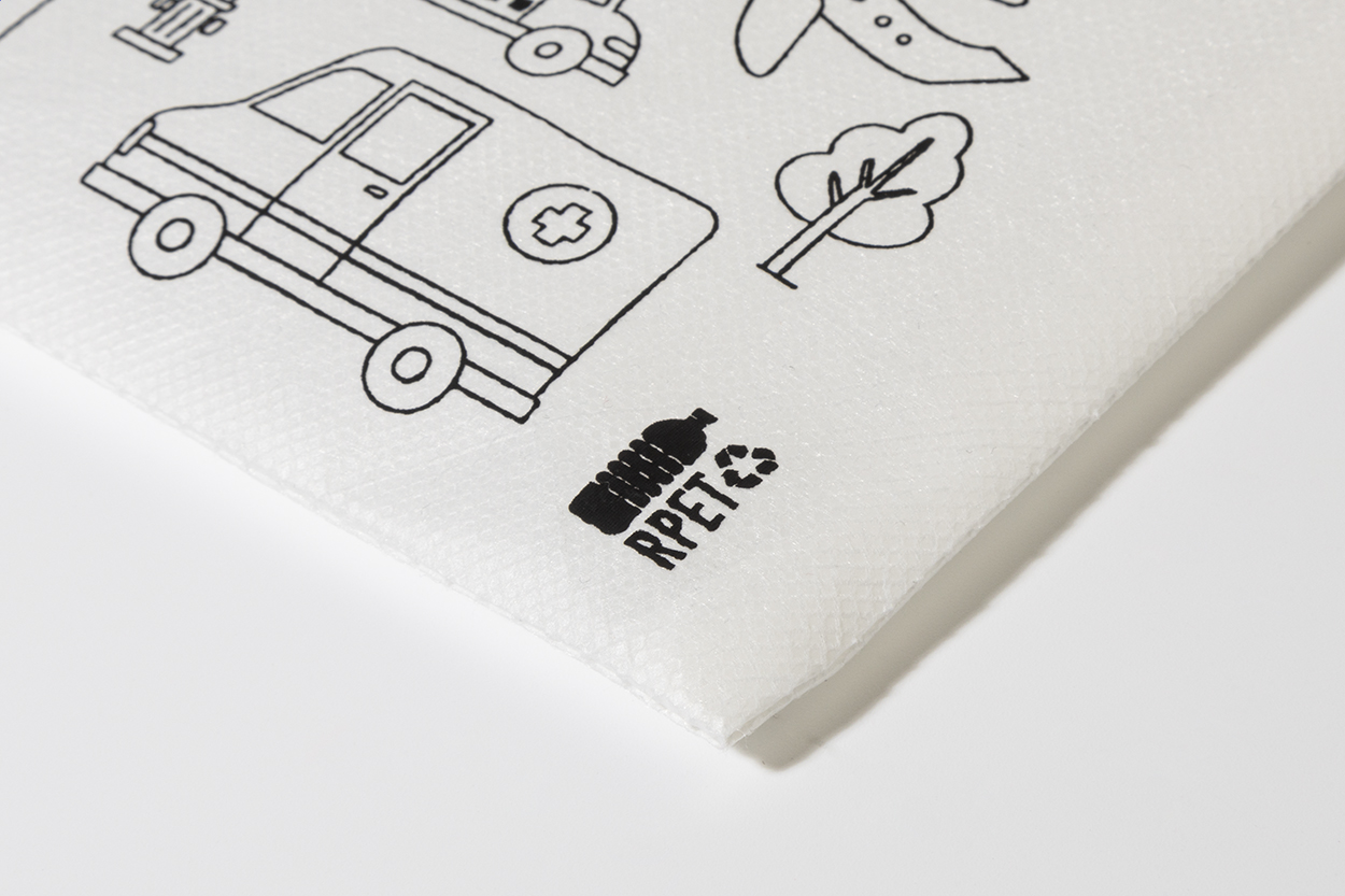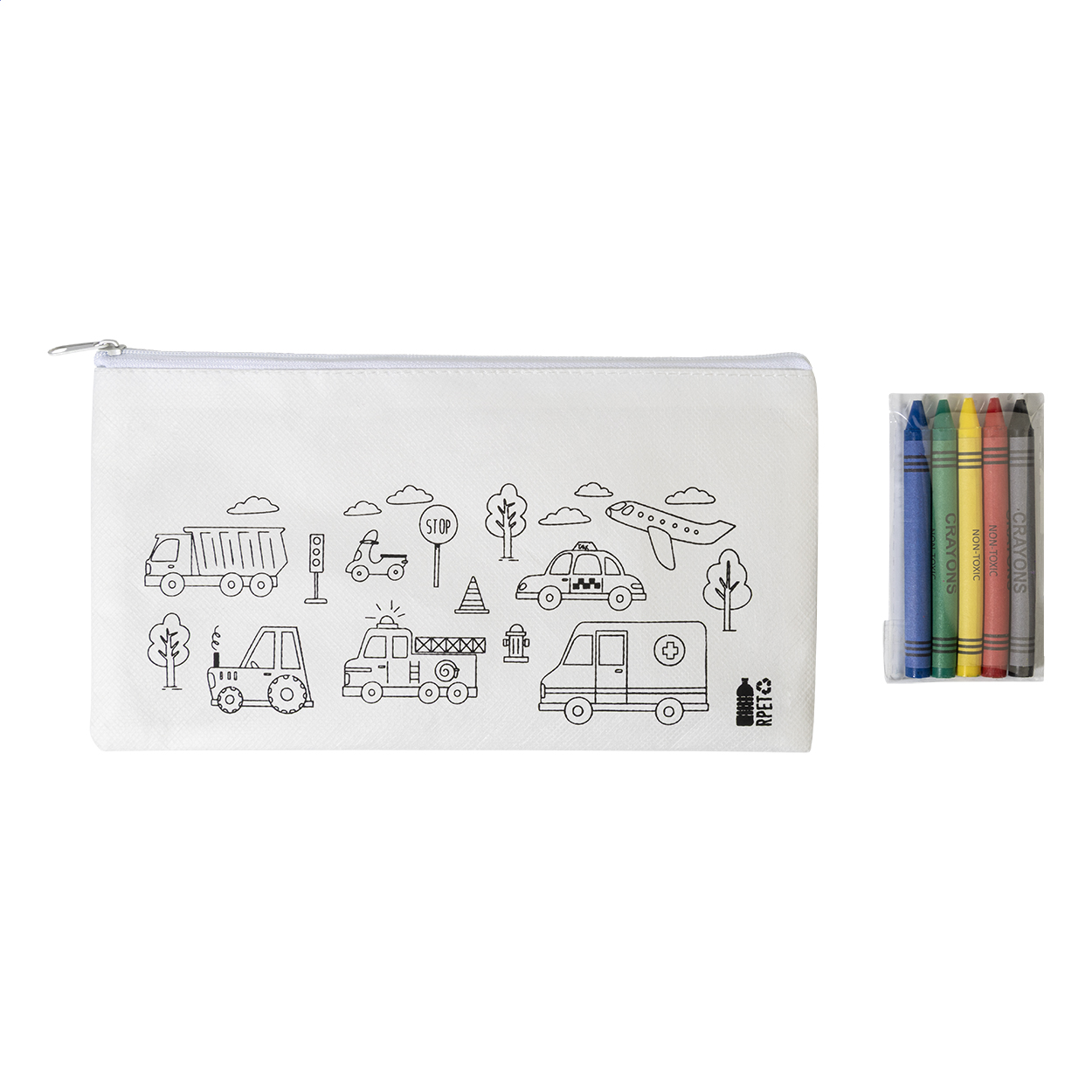 Pouzdro na pera se zipem z netkané RPET tkaniny s 5 voskovkami na vybarvení.