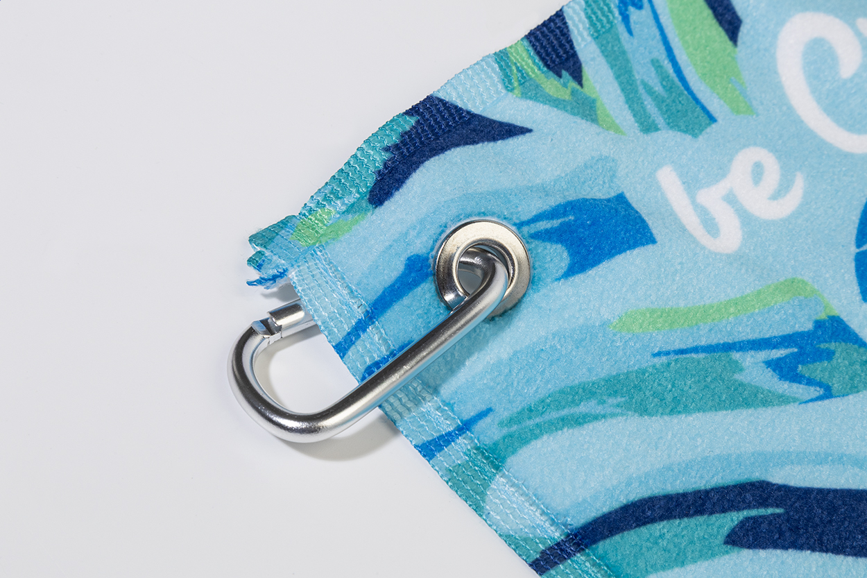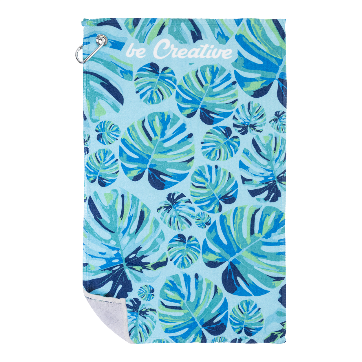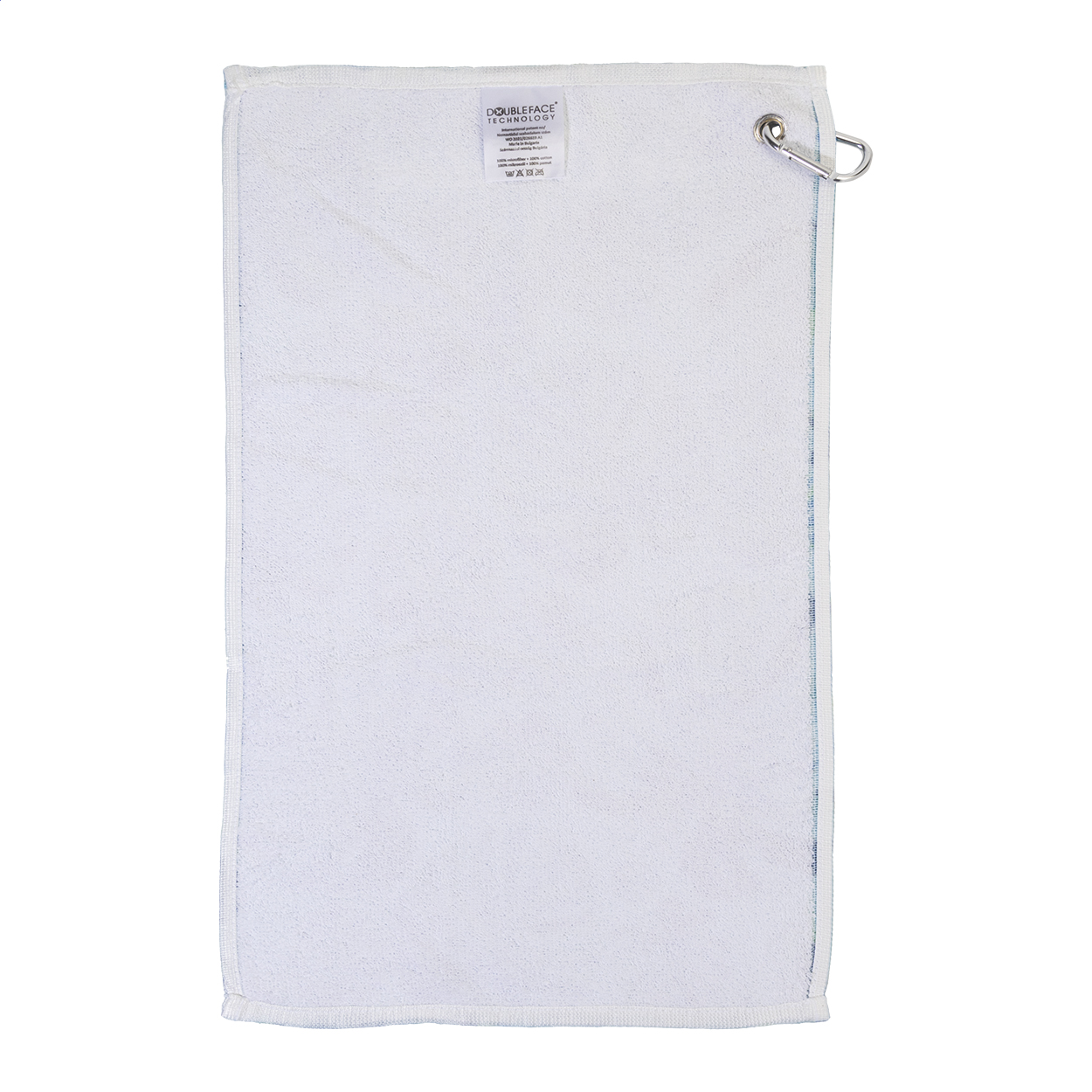 Oboustranný golfový ručník s kovovým věšákem a sublimačním potiskem na jedné straně. 100% bavlna + 100% mikrovlákno, 400 g/m². Cena včetně sublimačního tisku, nezahrnuje tiskovou přípravu. Min. mn.: 50 ks.