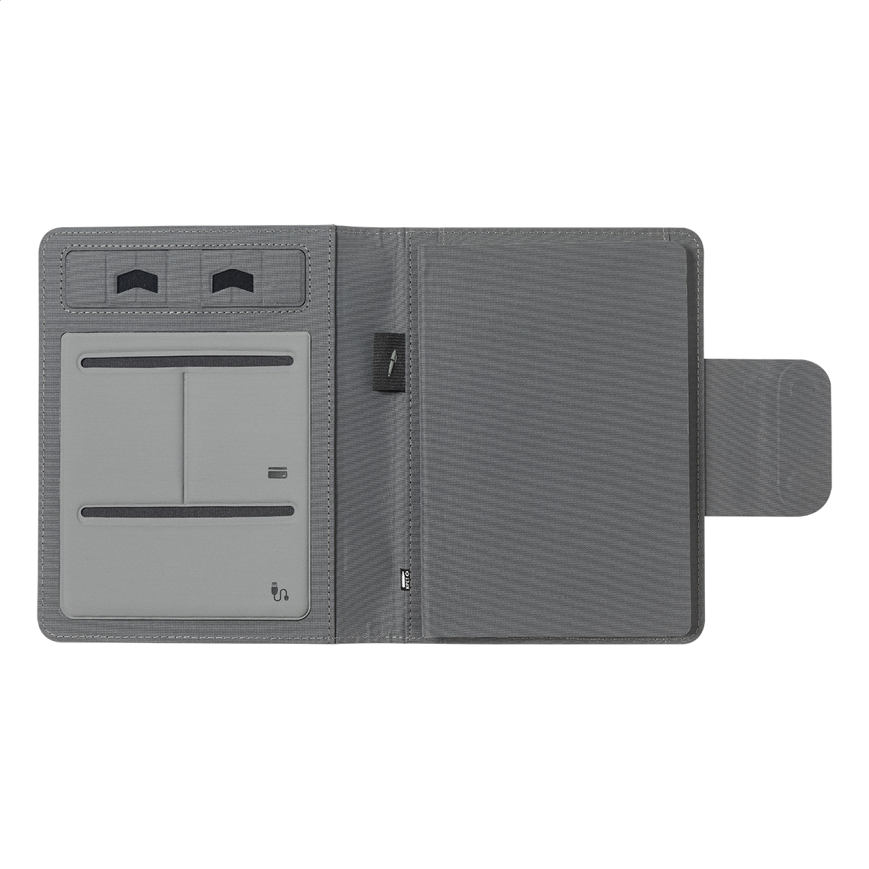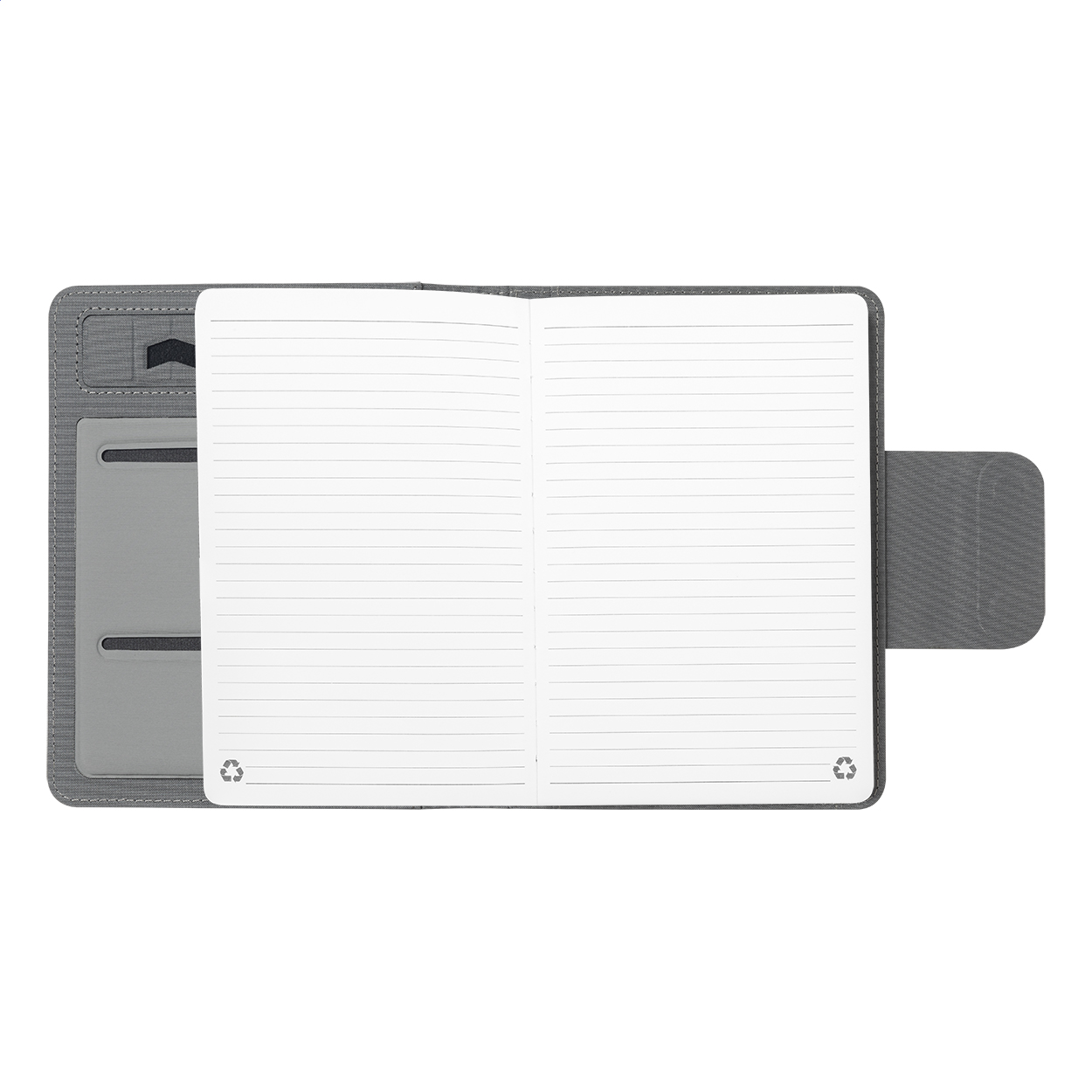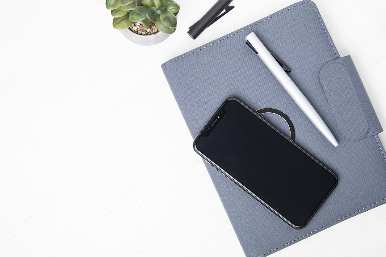 Polyesterová složka na dokumenty A5 z 300D RPET se zápisníkem (65 listů, linky), vestavěnou magnetickou bezdrátovou rychlonabíječkou (10W), power bankou 5000 mAh s portem pro nabíjení USB a skládacím držákem na mobil. Včetně USB nabíjecího kabelu.