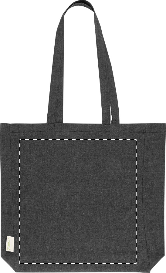 Nákupní taška s klínkem a dlouhými uchy ze 70 % recyklované bavlny a 30 % RPET polyesteru, 140 g/m². S výraznou etiketou o recyklované bavlně.