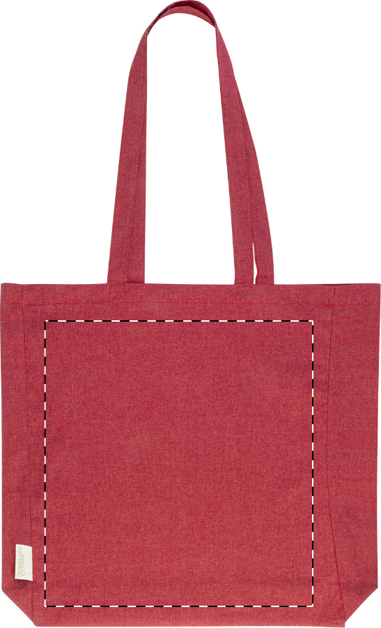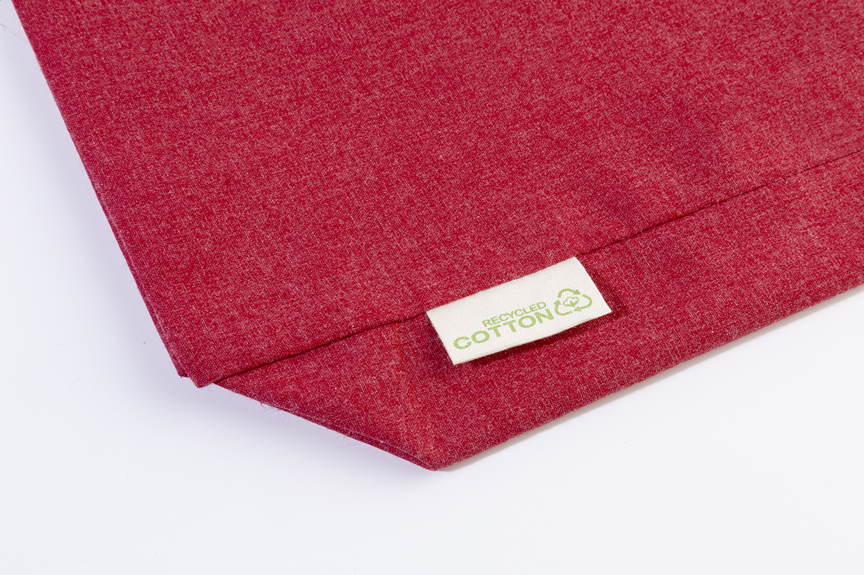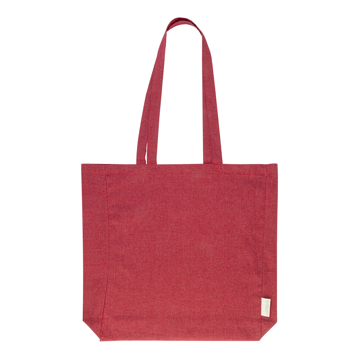 Nákupní taška s klínkem a dlouhými uchy ze 70 % recyklované bavlny a 30 % RPET polyesteru, 140 g/m². S výraznou etiketou o recyklované bavlně.