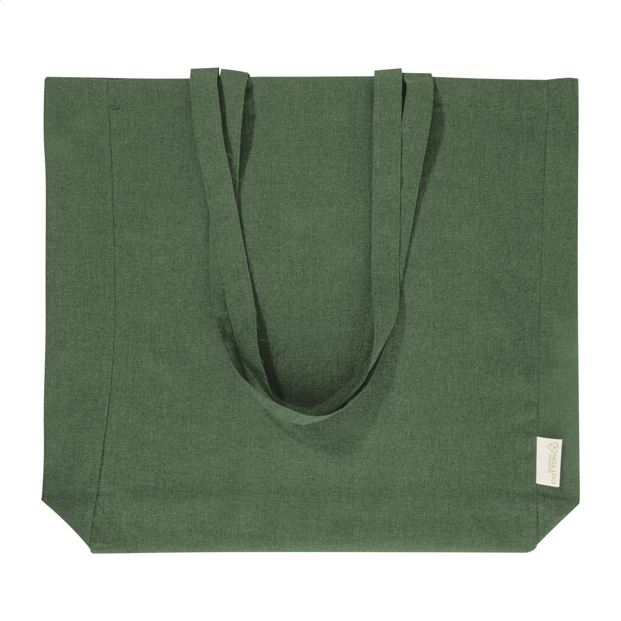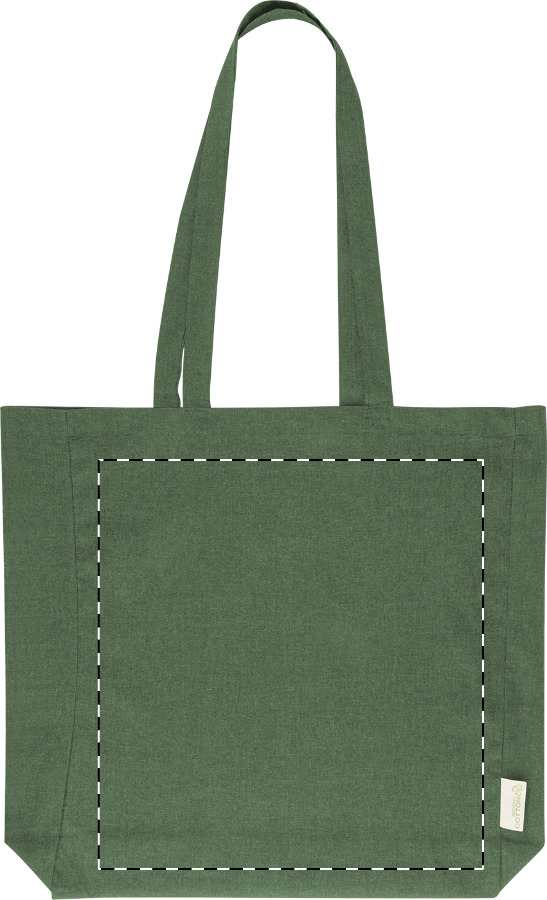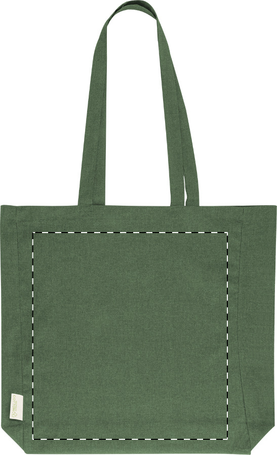Nákupní taška s klínkem a dlouhými uchy ze 70 % recyklované bavlny a 30 % RPET polyesteru, 140 g/m². S výraznou etiketou o recyklované bavlně.