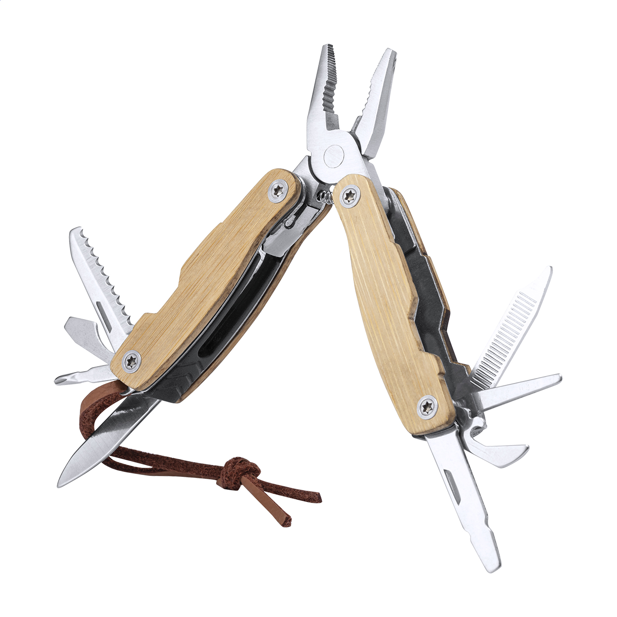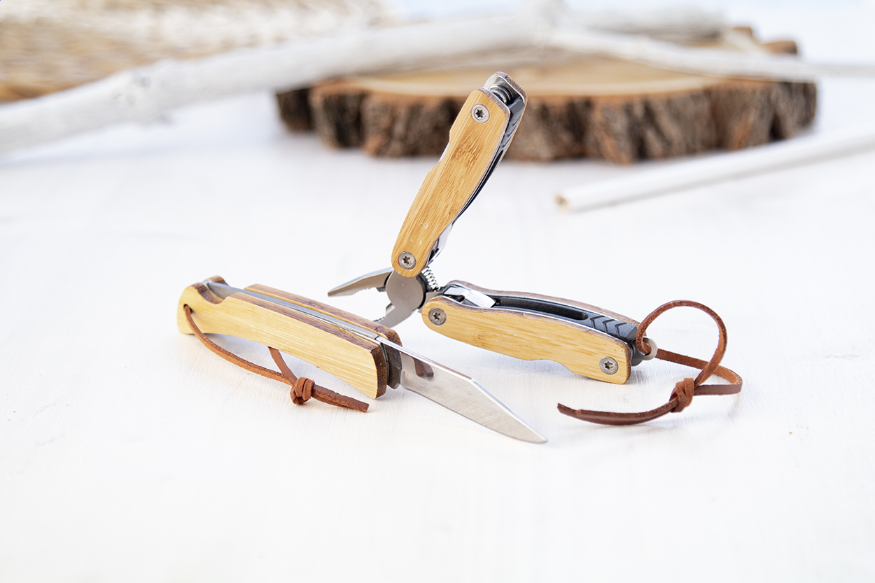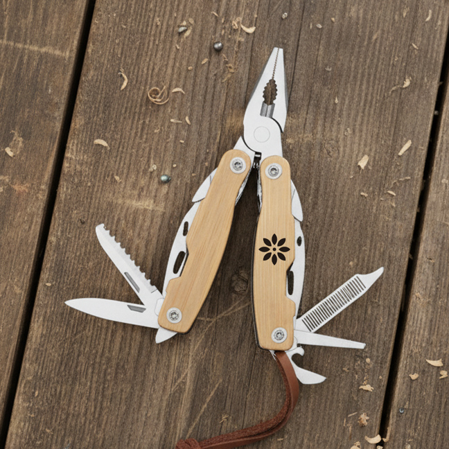 Hakim nářadí v přírodní barvě je kompaktní multifunkční nástroj z nerezové oceli s bambusovou rukojetí a 12 funkcemi. Hodí se jako praktický „EDC“ doplněk na cesty, do auta, na výlety nebo jako užitečný dárek, který nezůstane ležet v šuplíku. Součástí je i šňůrka z kůže pro snadnější nošení a manipulaci.
