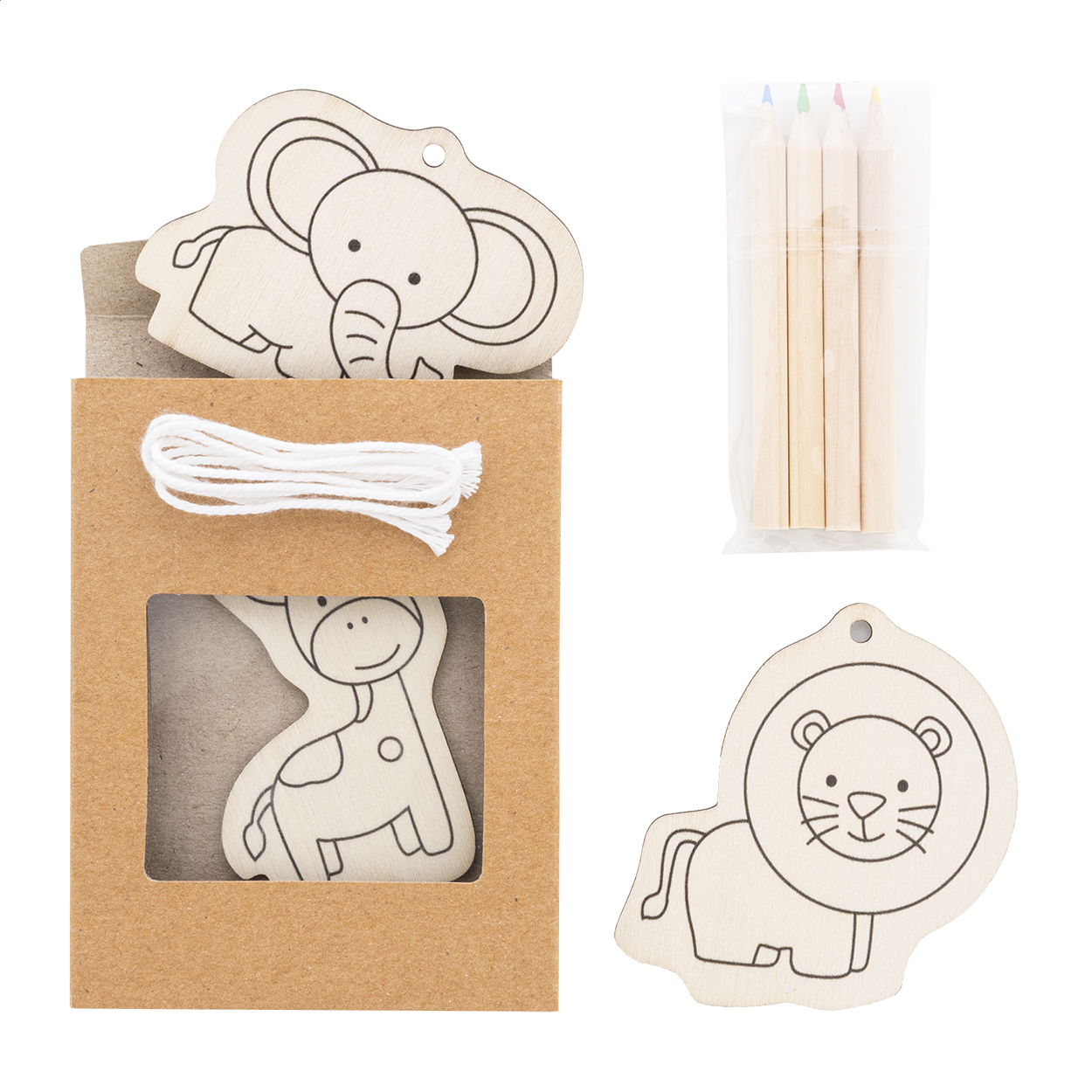 3dílná sada dřevěných omalovánek se zvířátky, včetně 4 dřevěných pastelek a závěsných šňůrek. V krabičce z kraftového papíru.