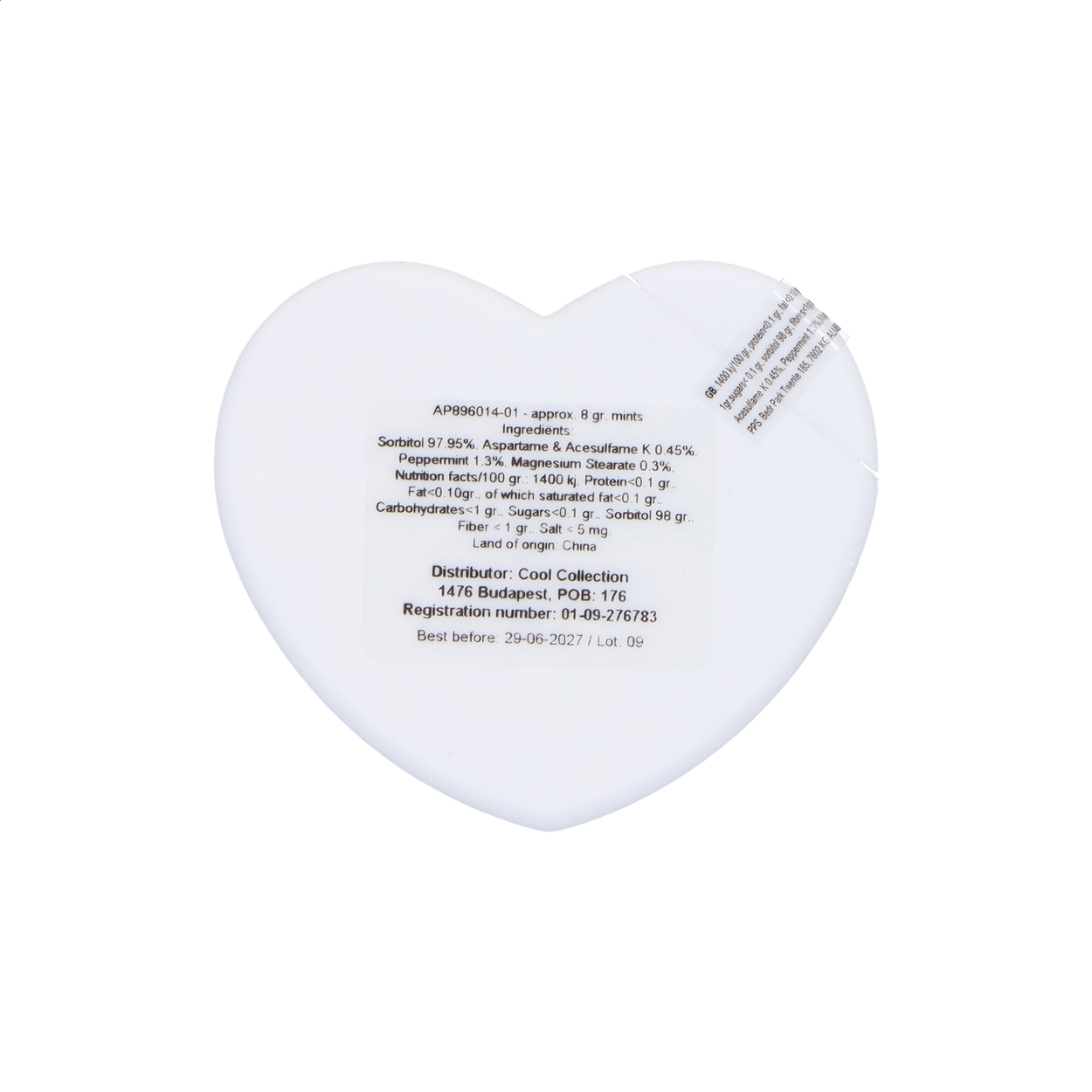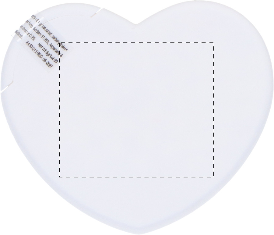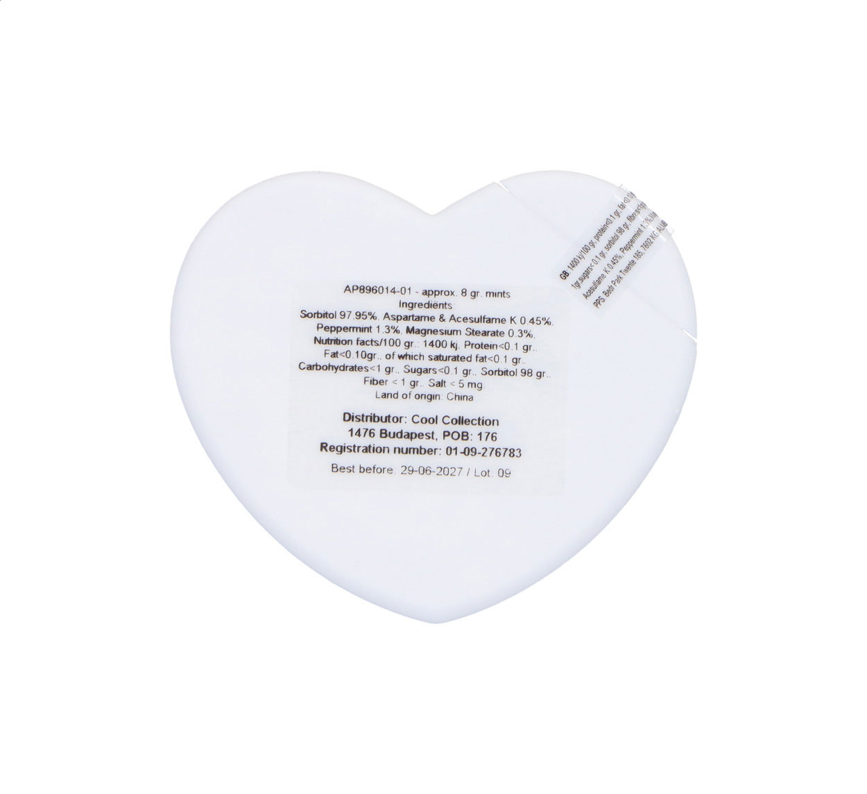 Plastový dávkovač mintových bonbónů ve tvaru srdce s cca. 8 gramů mentolových bonbonů bez cukru.