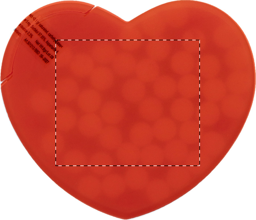 Plastový dávkovač mintových bonbónů ve tvaru srdce s cca. 8 gramů mentolových bonbonů bez cukru.