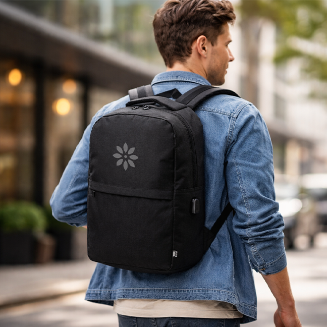 Obsahuje praktický USB výstup pro dobíjení telefonu za pohybu a přináší maximální pohodlí s ergonomicky navrženými ramenními popruhy a polstrováním zad. Výrazný štítek informuje o ekologickém původu a podtrhuje moderní design.