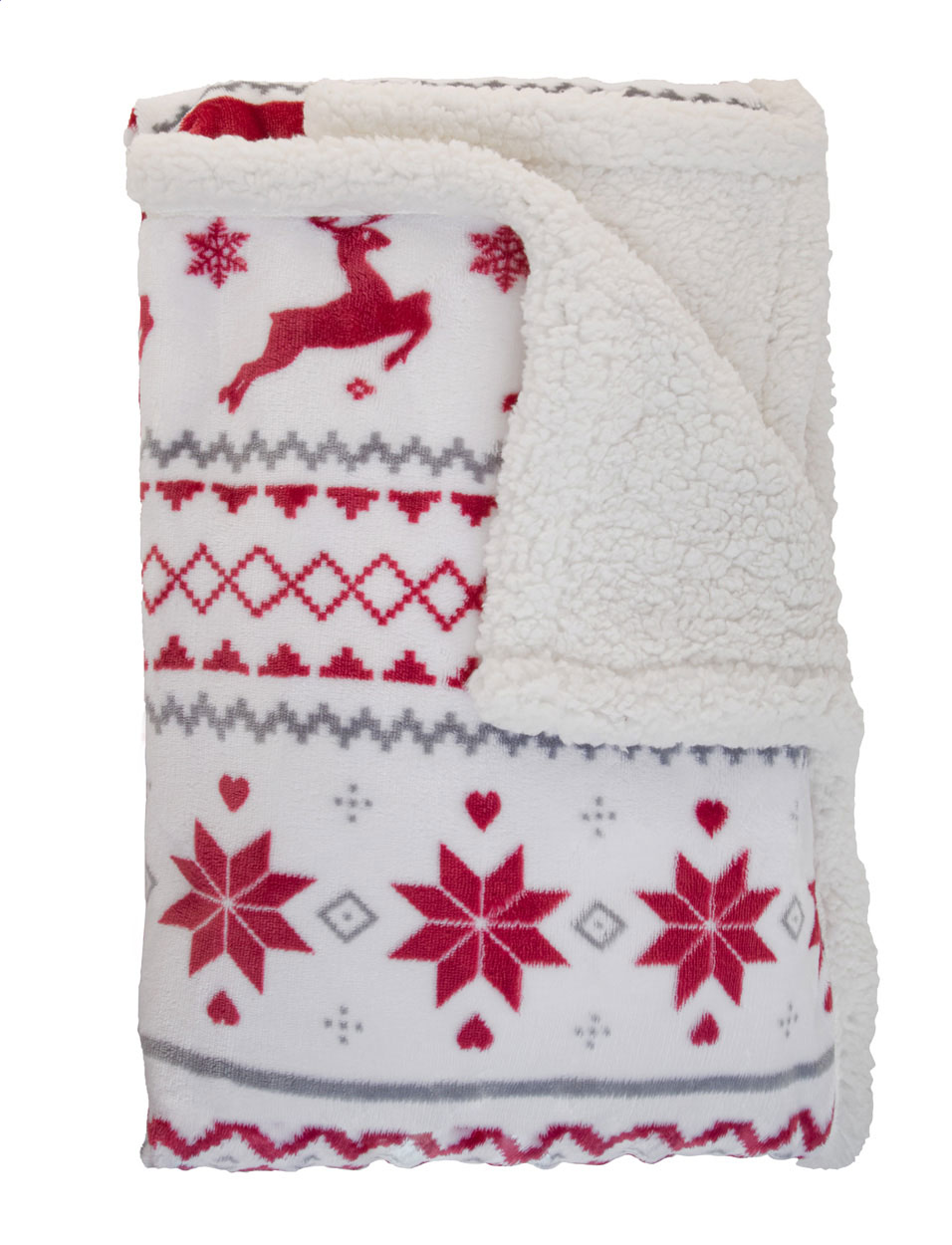 Dvouvrstvá vánoční deka ze 230 g/m² flanelového fleecu RPET a oboustrannou podšívkou z RPET sherpa fleecu 210 g/m². Zabalené do stuhy a potisknutelné papírové karty.