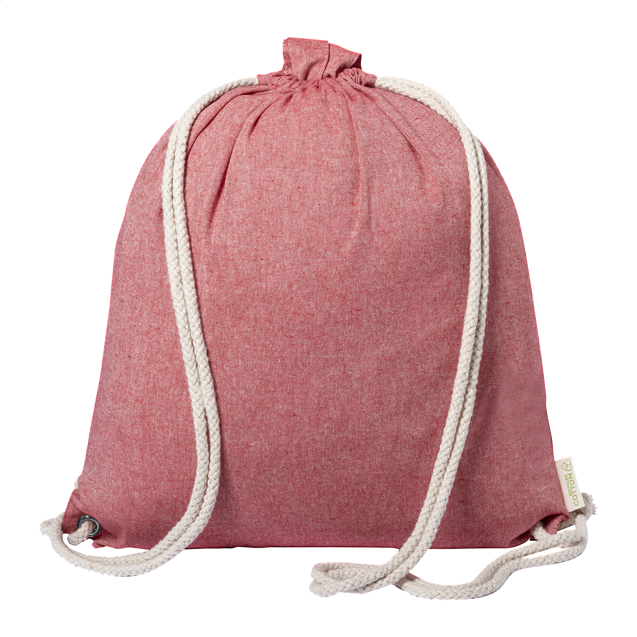 Látková taška z recyklované bavlny s dlouhými uchy a pletenými šňůrkami, díky kterým je možné tašku nosit také jako batoh. 100% recyklovaná bavlna, gramáž látky 140 g/m2.