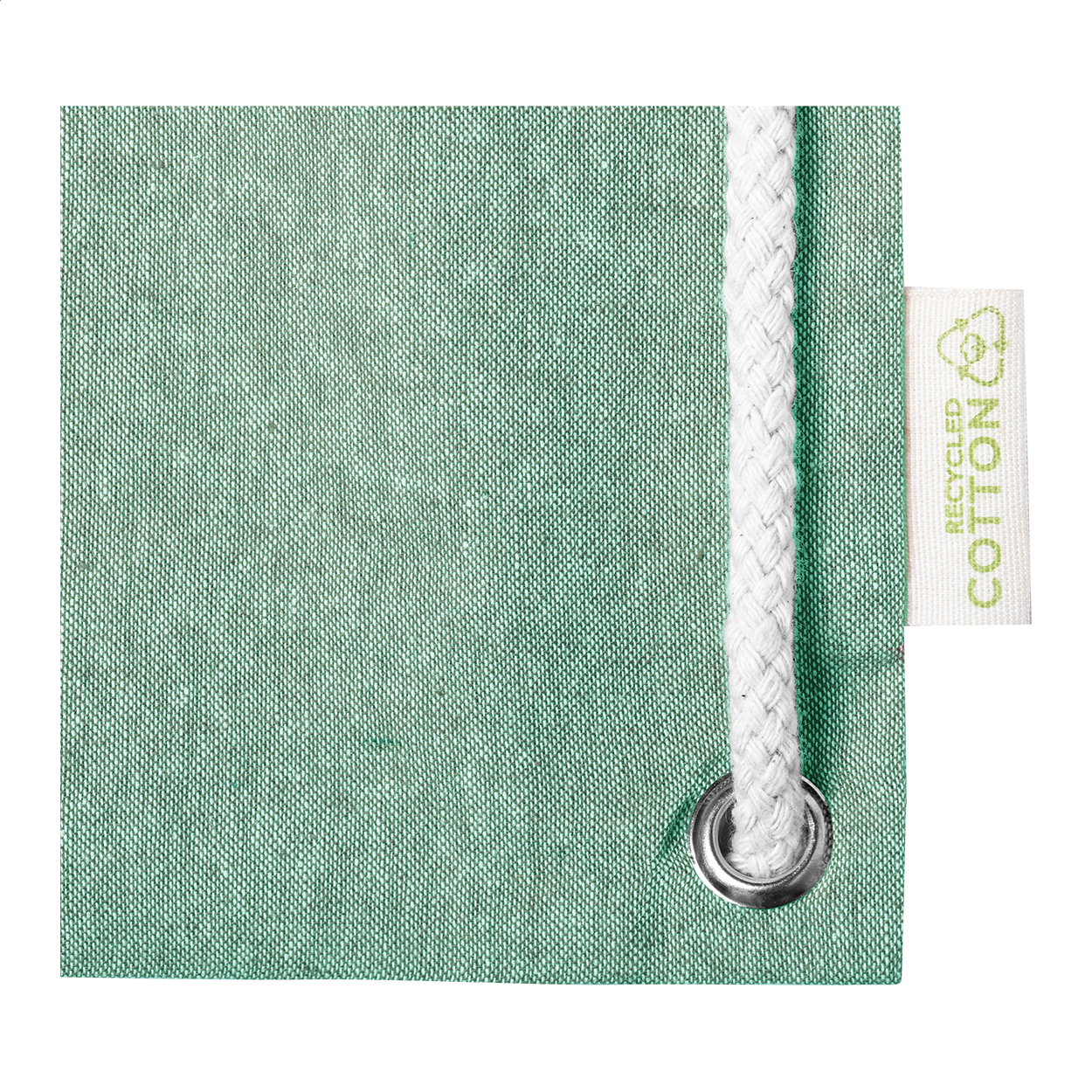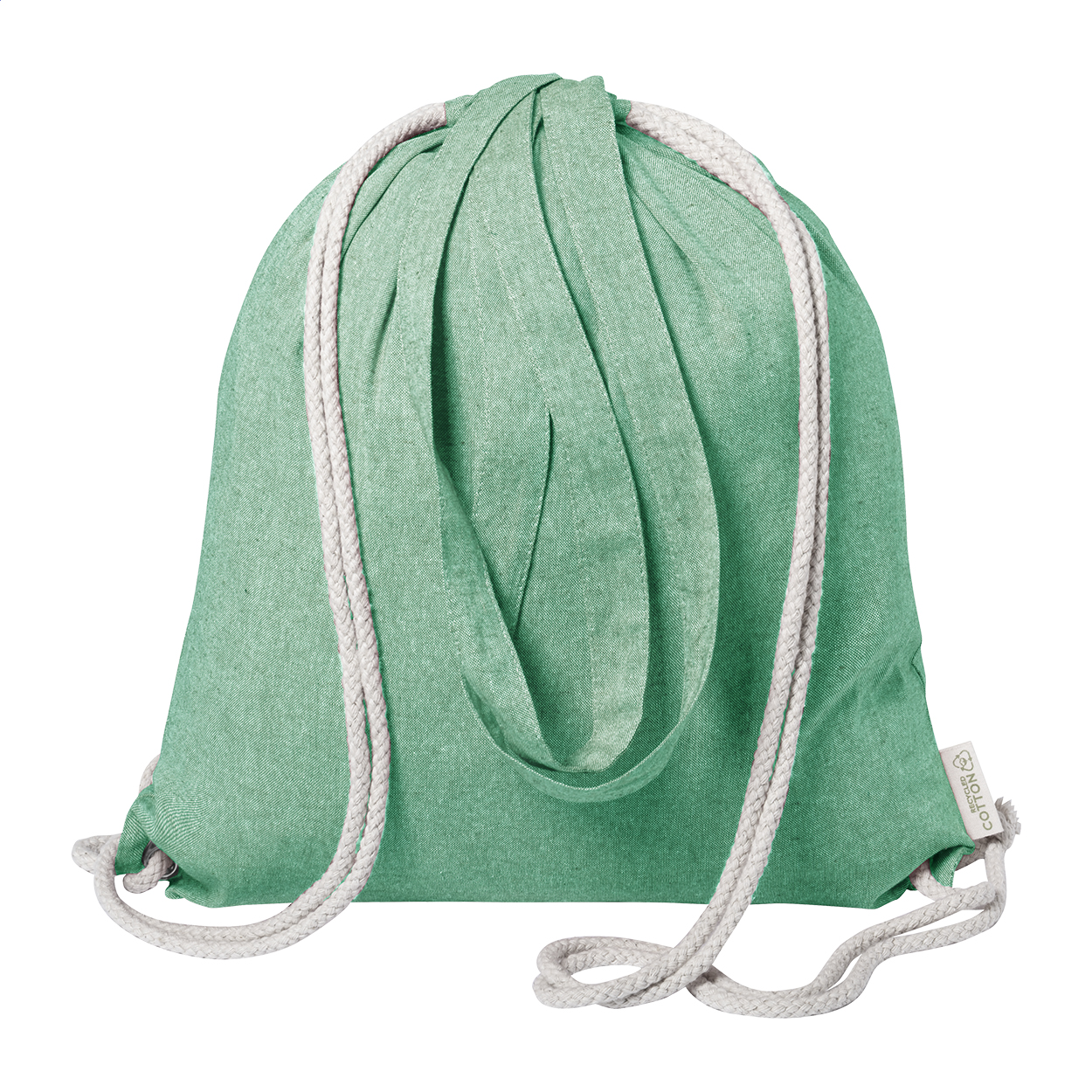 Látková taška z recyklované bavlny s dlouhými uchy a pletenými šňůrkami, díky kterým je možné tašku nosit také jako batoh. 100% recyklovaná bavlna, gramáž látky 140 g/m2.