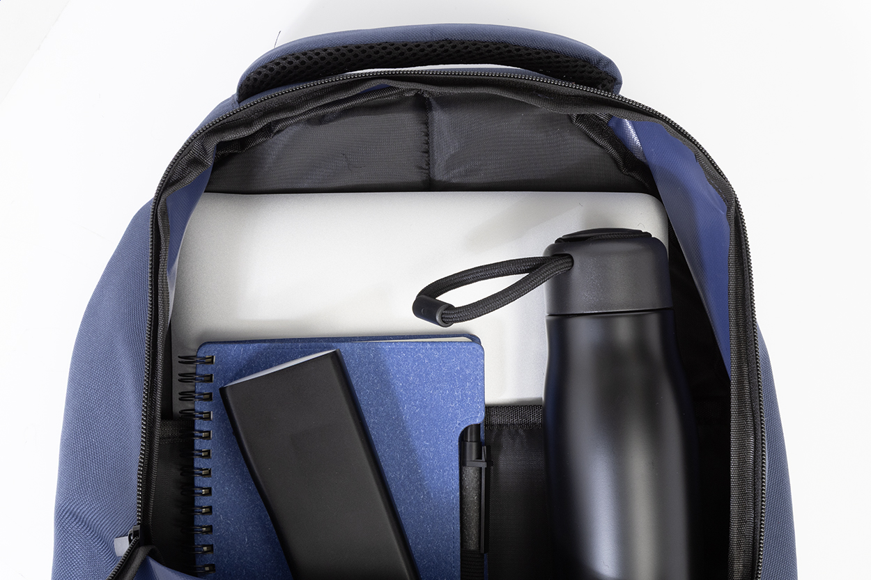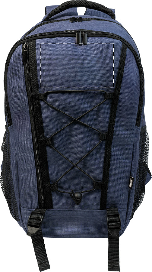 Outdoorový batoh z RPET s přihrádkami na zip a přední kapsou, polstrovanou přihrádkou na notebook (15"), síťovanými bočními kapsami a elastickými šňůrkami vpředu. S polstrovanými zády a ramenními popruhy. Polyester 600D RPET s výrazným štítkem RPET.
