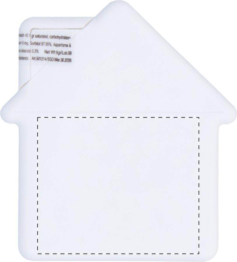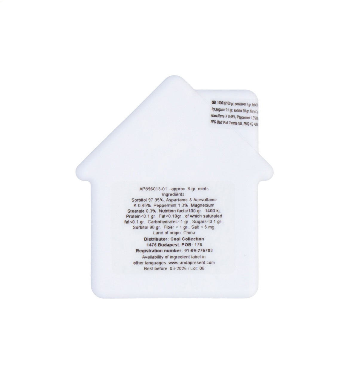 Plastový dávkovač mintových bonbónů ve tvaru domečku s cca. 8 gramů mentolových bonbonů bez cukru.