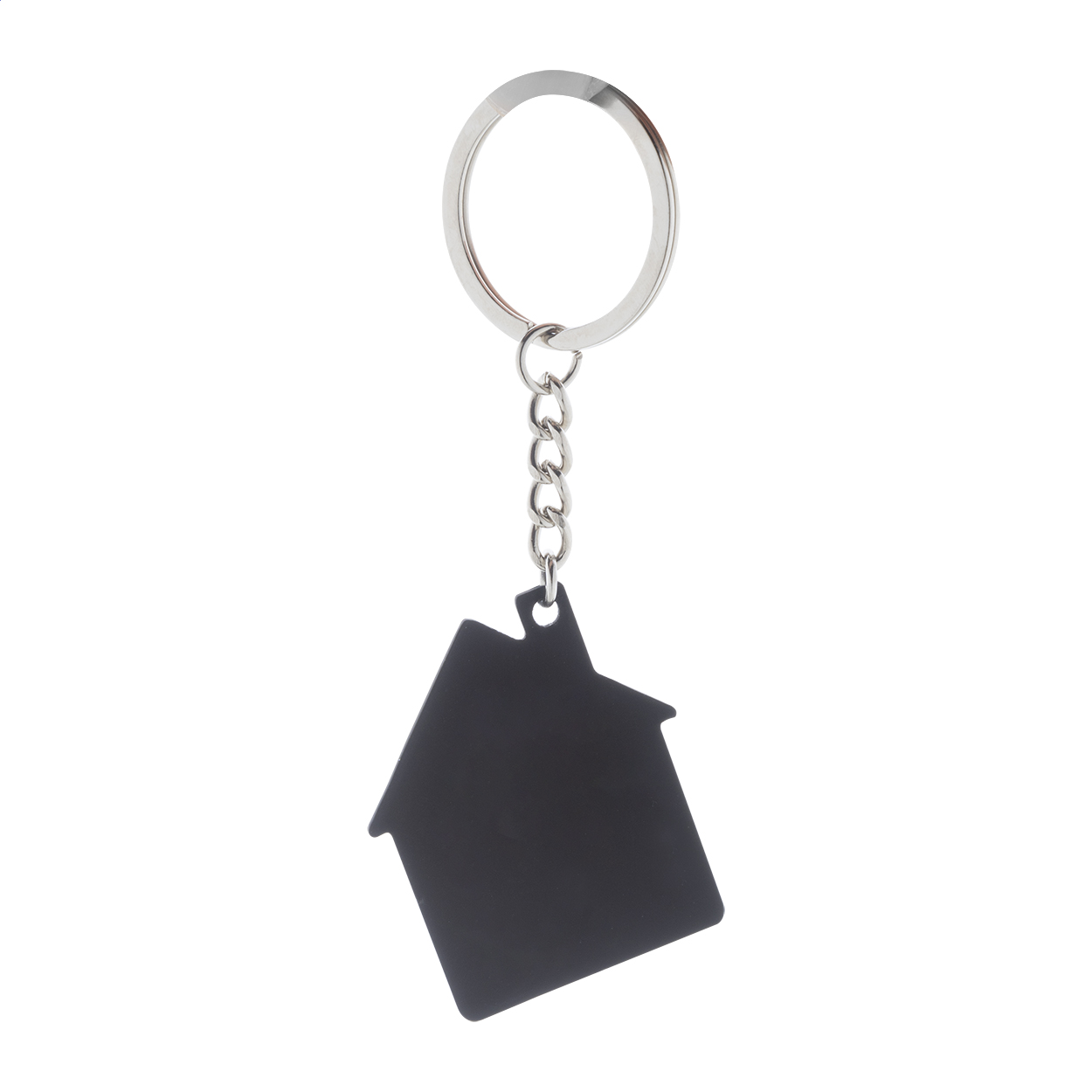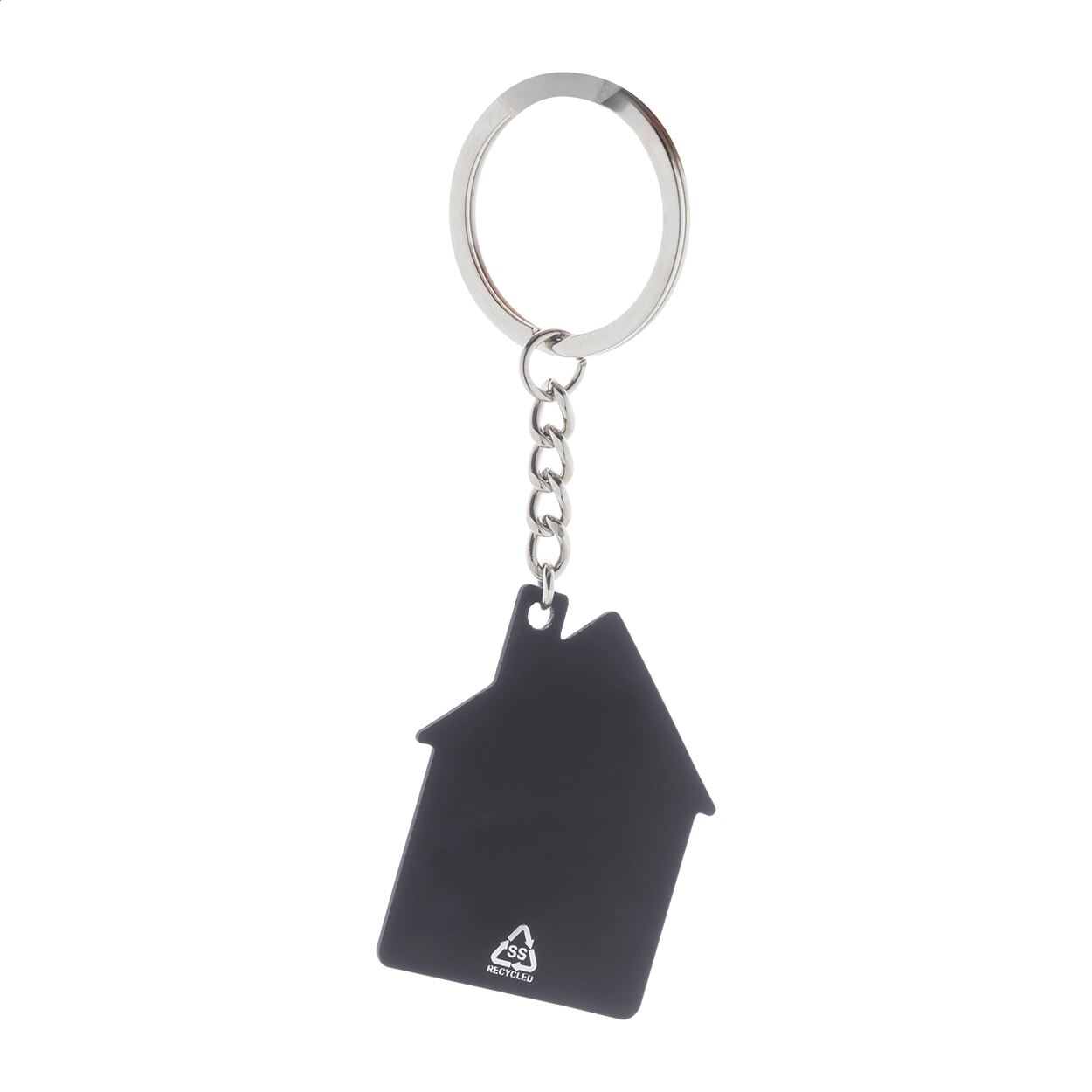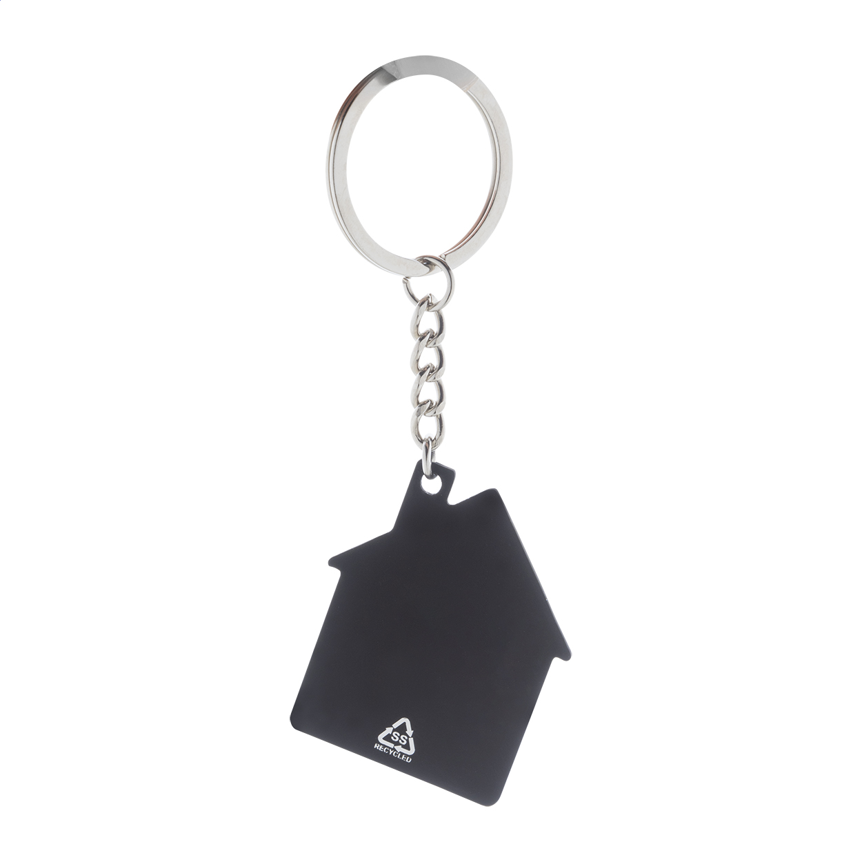 Přívěšek na klíče z recyklované nerezové oceli ve tvaru domečku s pogumovaným povrchem. Se speciální vrstvou pro zrcadlové laserové gravírování.