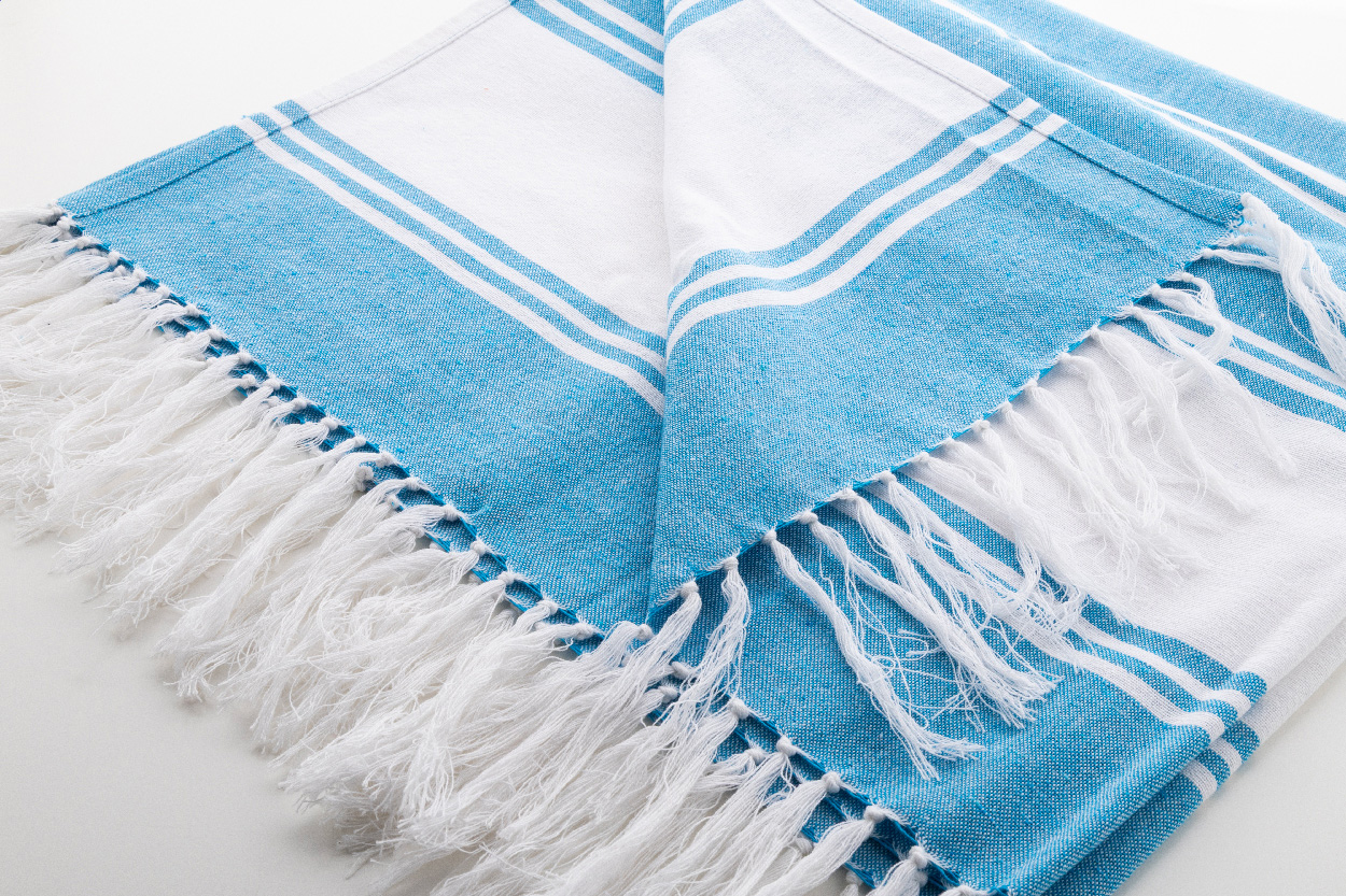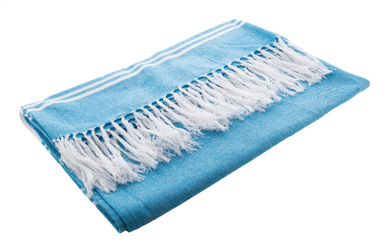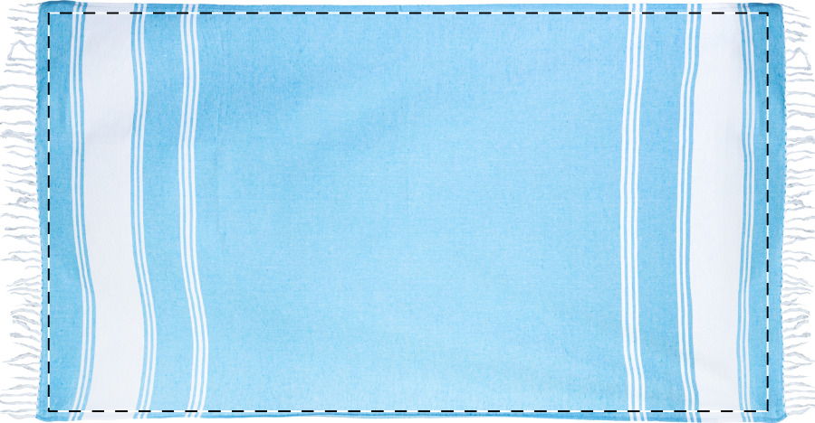 Dvoubarevný pruhovaný plážový ručník pareo ze 70% bavlny a 30% polyesteru. 210 g/m².