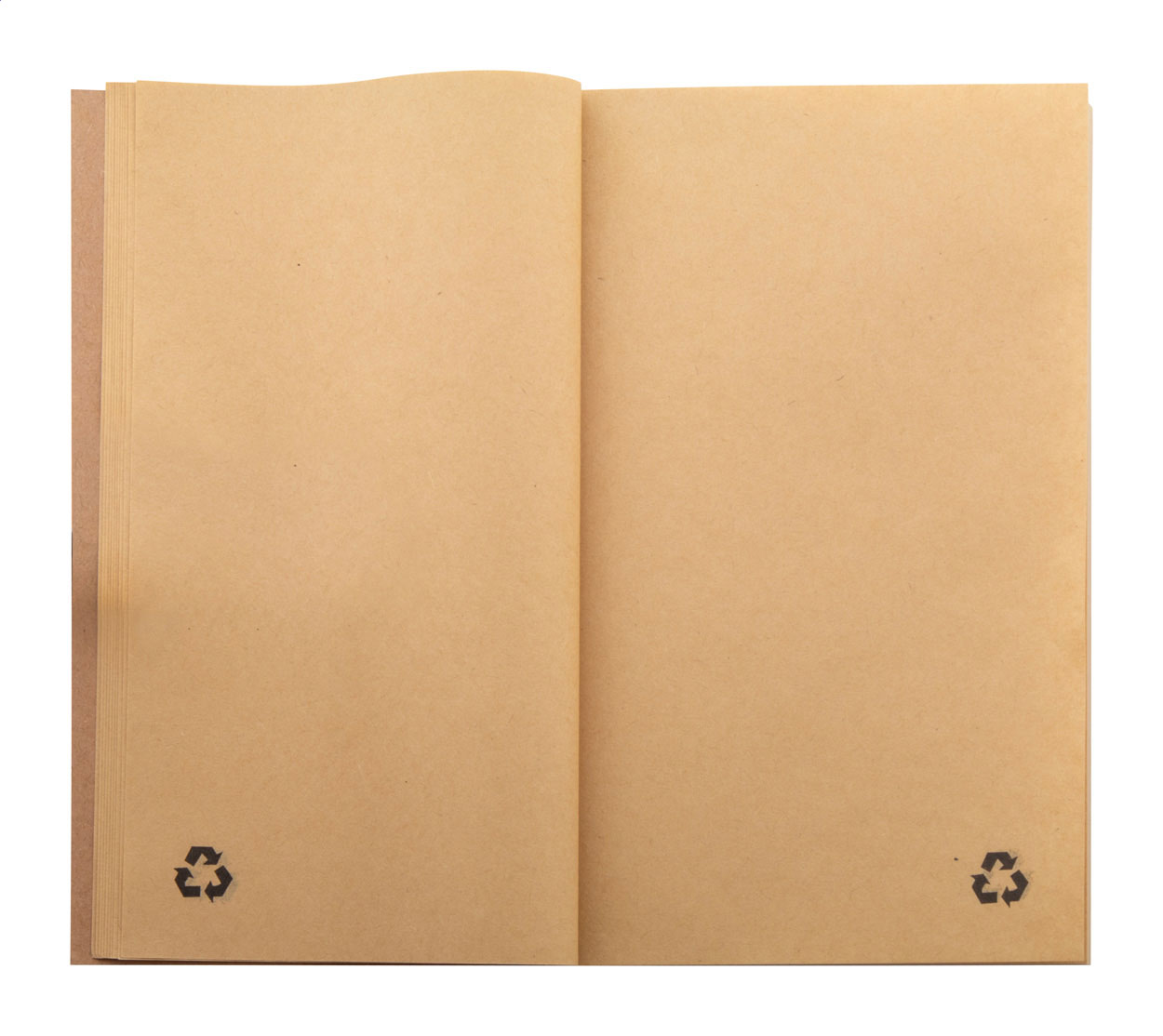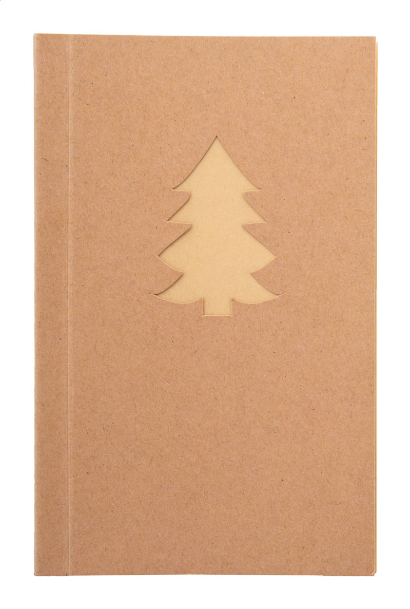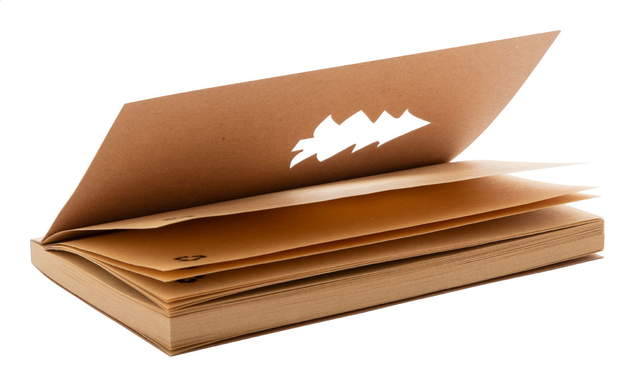 Blok potažený recyklovaným papírem s vysekávaným vánočním stromkem na přebalu a 85 prázdnými listy z recyklovaného kraftového papíru.