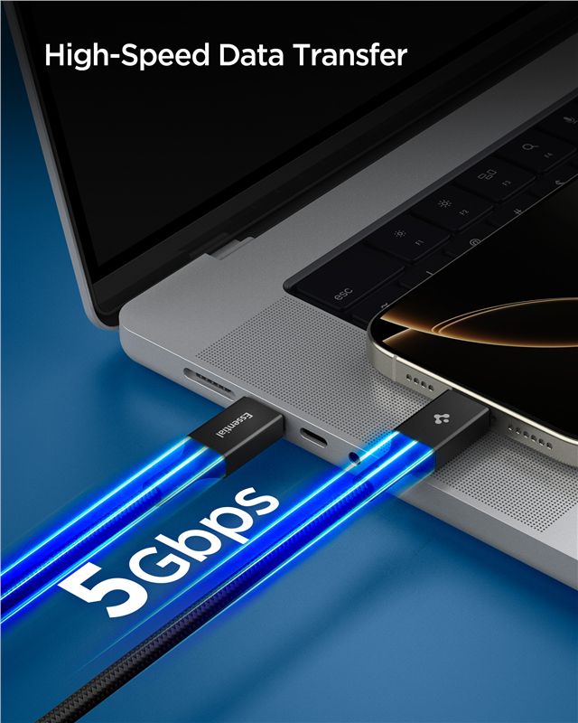 Spigen Essential USB-C na USB-C Fabric kabel o délce 1,5 metru v černém provedení nabízí optimální poměr mezi dosahem a praktičností. Umožňuje přenos dat rychlostí 5 Gb/s a bezpečné nabíjení výkonem až 100 W pro širokou škálu elektroniky od telefonů po výkonné laptopy.