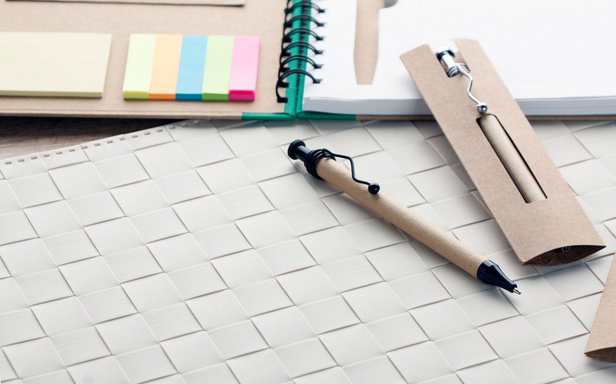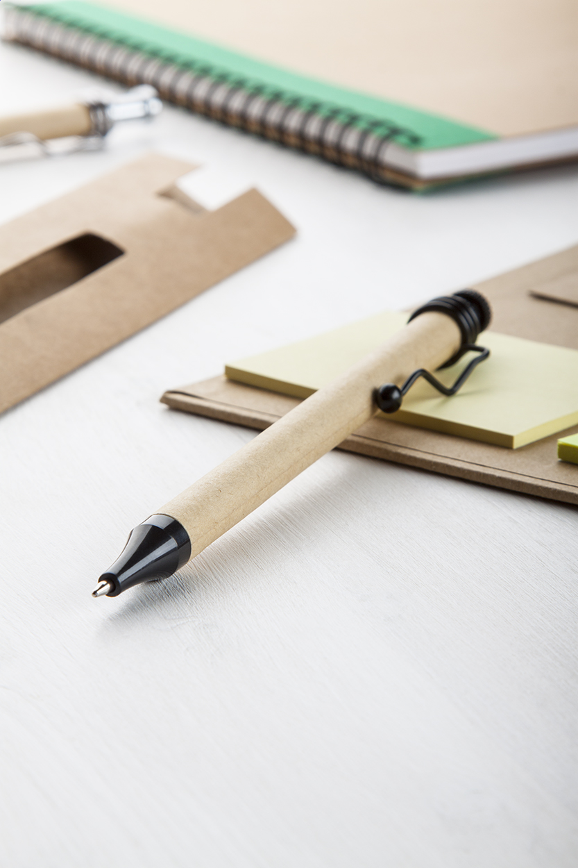 Kuličkové pero s obalem vyrobeným z recyklovaného papíru a s modrou náplní.