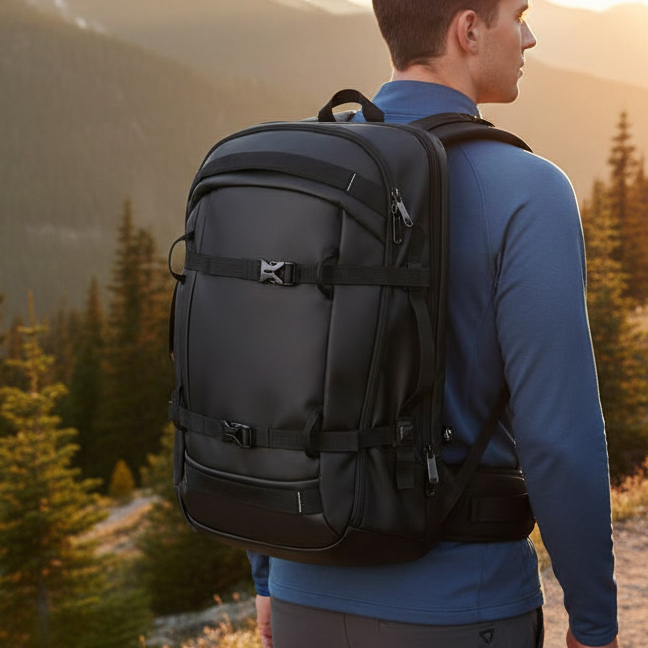 Batoh na notebook z recyklovaného polyesteru s vysokou hustotou 900D, voděodolným povrchem a podšívkou z recyklovaného polyesteru 210D. Má 2 hlavní oddíly, přičemž zadní oddíl má polstrovanou přepážku pro notebook do velikosti 17,3“ a přední kapsu na zip. Zadní část s dodatečným polstrováním a rukojetí na kolečkách pro případ potřeby. Obsahuje odnímatelné kompresní popruhy na přední straně batohu a reflexní detaily na rukojetích a popruzích. Objem až 21 l