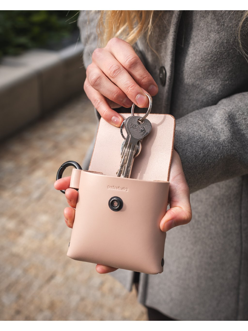Tato kapsička z 2 mm silné italské třísločiněné usně je ideální na drobnosti nebo klíče, které chcete mít bezpečně uložené a vždy po ruce. Díky zabarvenému hladkému rubu nepotřebuje podšívku a je krásně odolná. S kompaktními rozměry cca 10 × 10 × 3,5 cm a hmotností jen cca 0,1 kg je lehká a praktická. Snadno ji připnete pomocí kulaté karabinky dovnitř tašky Laura, na poutko kalhot, vodítko nebo opasek.