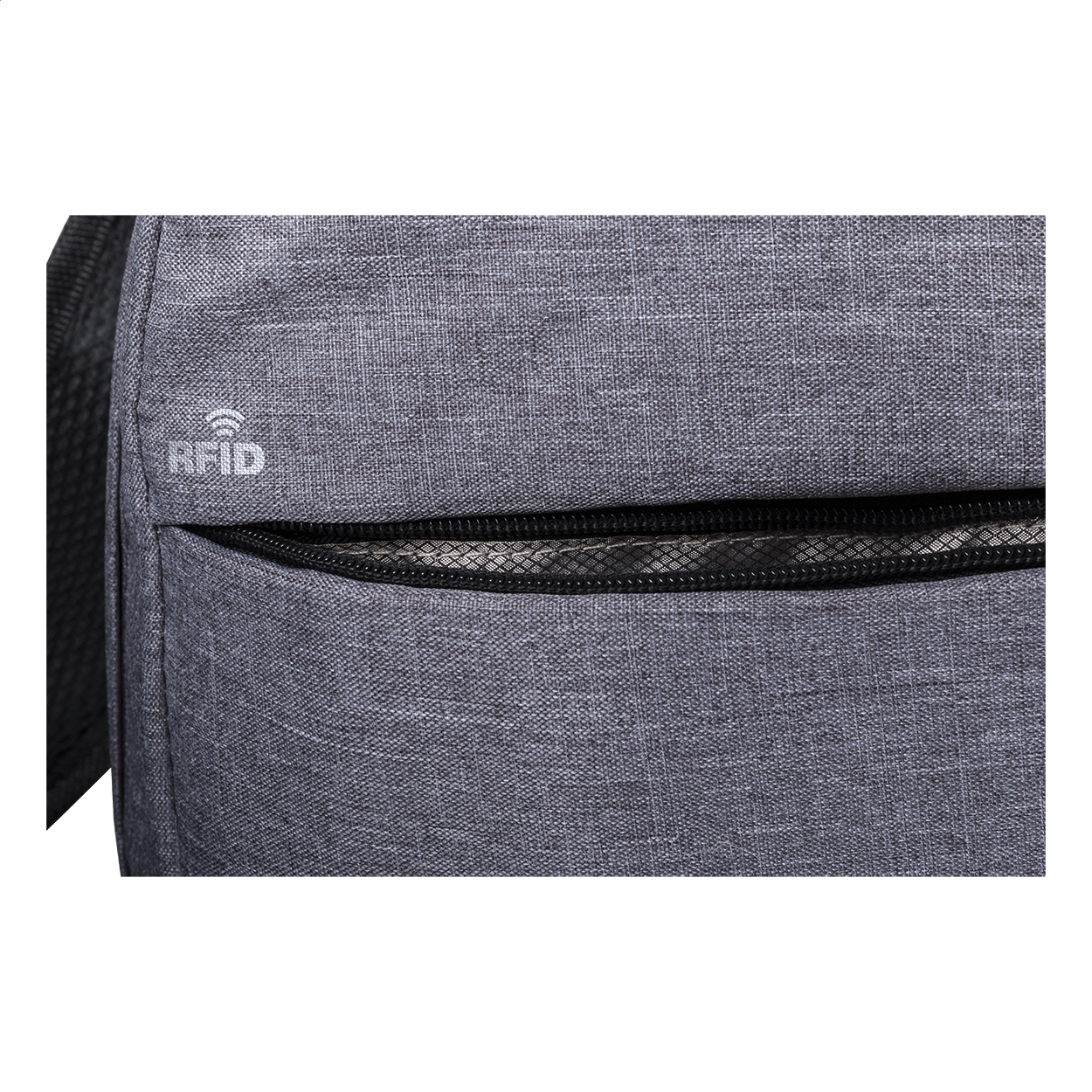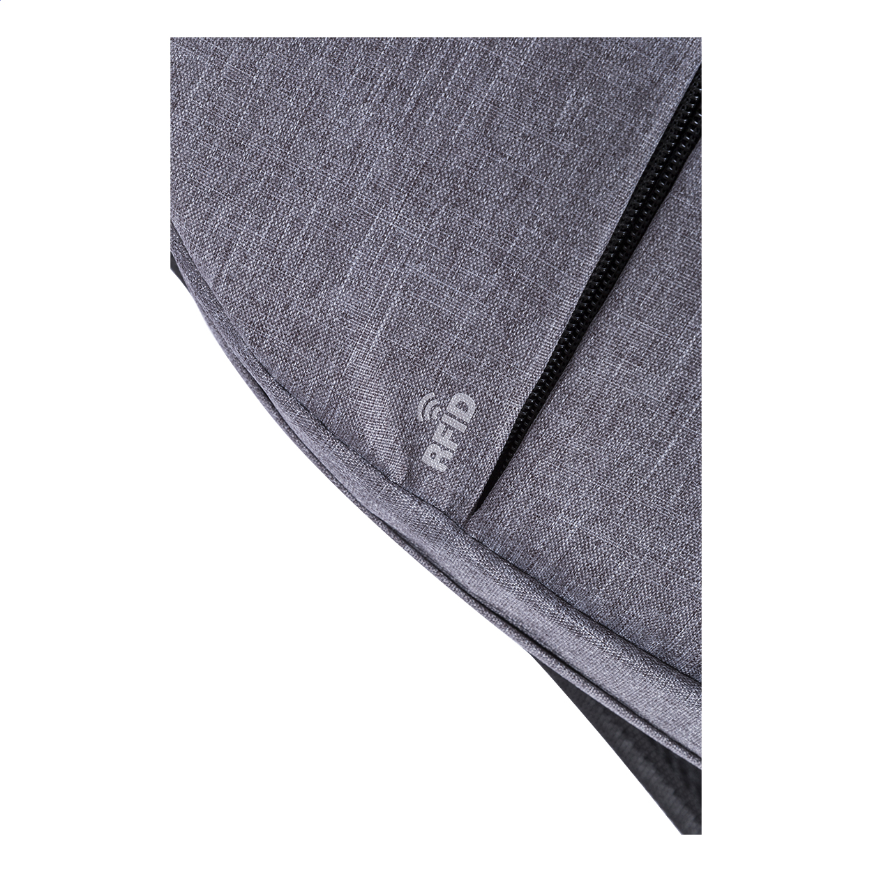 Batoh s RDFID ochranou s mnoha přihrádkami na zip, polstrovaným oddílem na laptop (až 15 palců), polstrovanými zády a ramenními popruhy. S vestavěným USB pro připojení powerbanky. 300D polyester.