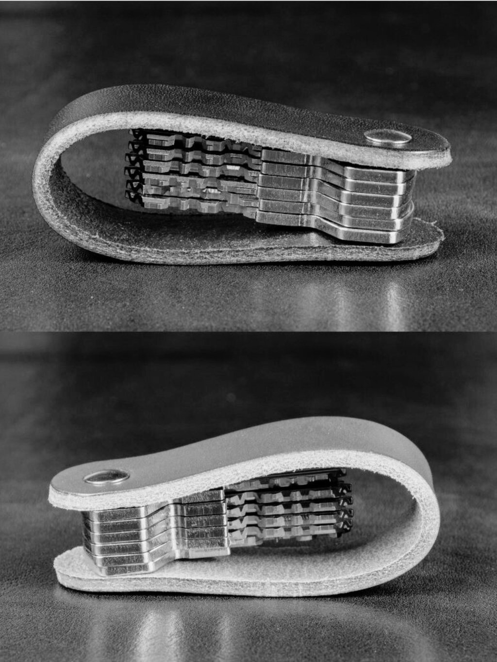Minimalistická klíčenka, která se vejde do každé kapsy a zabrání potrhání kapes a hlučnému cinkání. Díky svým drobným rozměrům se hodí i do dámské kabelky. Jednoduchý systém klíčenky na šroubovacím čepu pojme až cca 6 běžných klíčů a díky snadnému členění už nebudete hledat ten jediný správný klíč od bytu – prostě jej zařadíte třeba hned na začátek. Konstrukce klíčenky se skládá z jedné vrstvy silnější opaskové kůže. Součástí balení jsou kovové podložky, které slouží k vymezení volné kapacity klíčenky v případě, že si vystačíte s méně klíči.