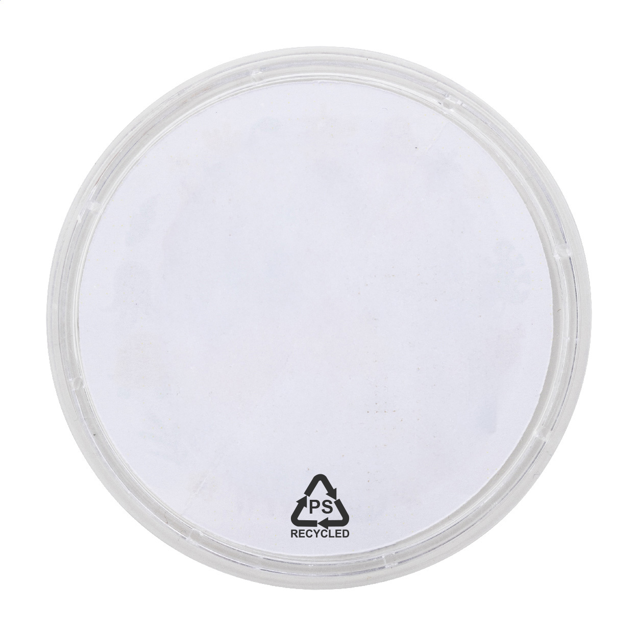Kulatý labyrint z recyklovaného PS se třemi kovovými kuličkami. S barevnou papírovou vložkou na míru. Cena zahrnuje digitální tisk na obou stranách, nezahrnuje tiskovou přípravu. Min. mn.: 100 ks.