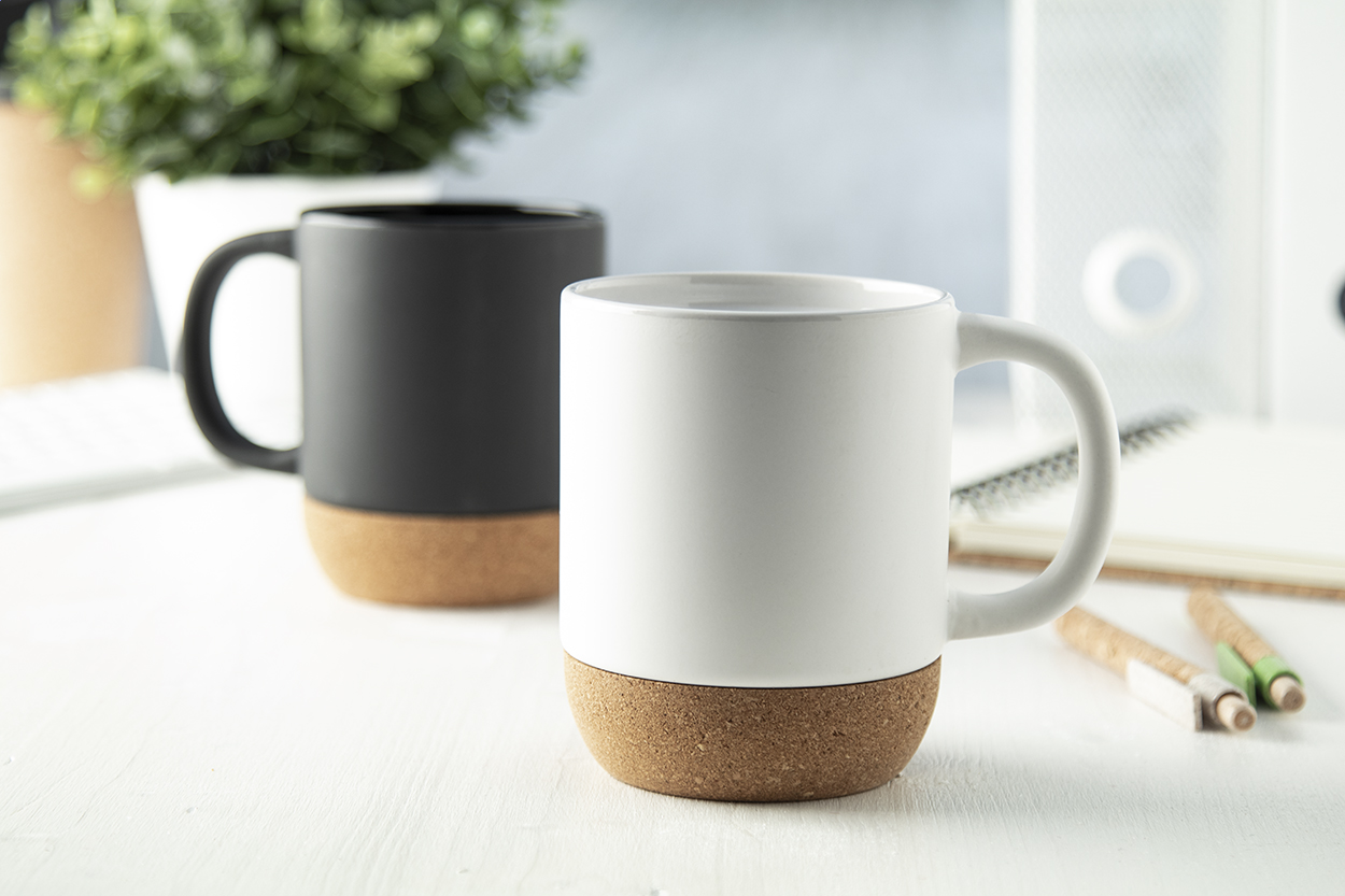 Keramický hrnek s přírodní korkovou základnou a objemem 420 ml. V krabici z kraftového papíru.