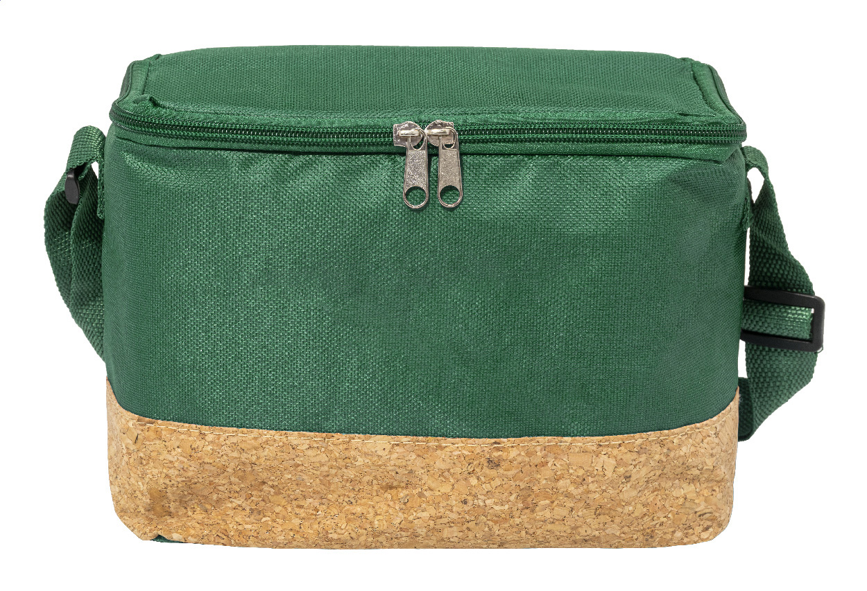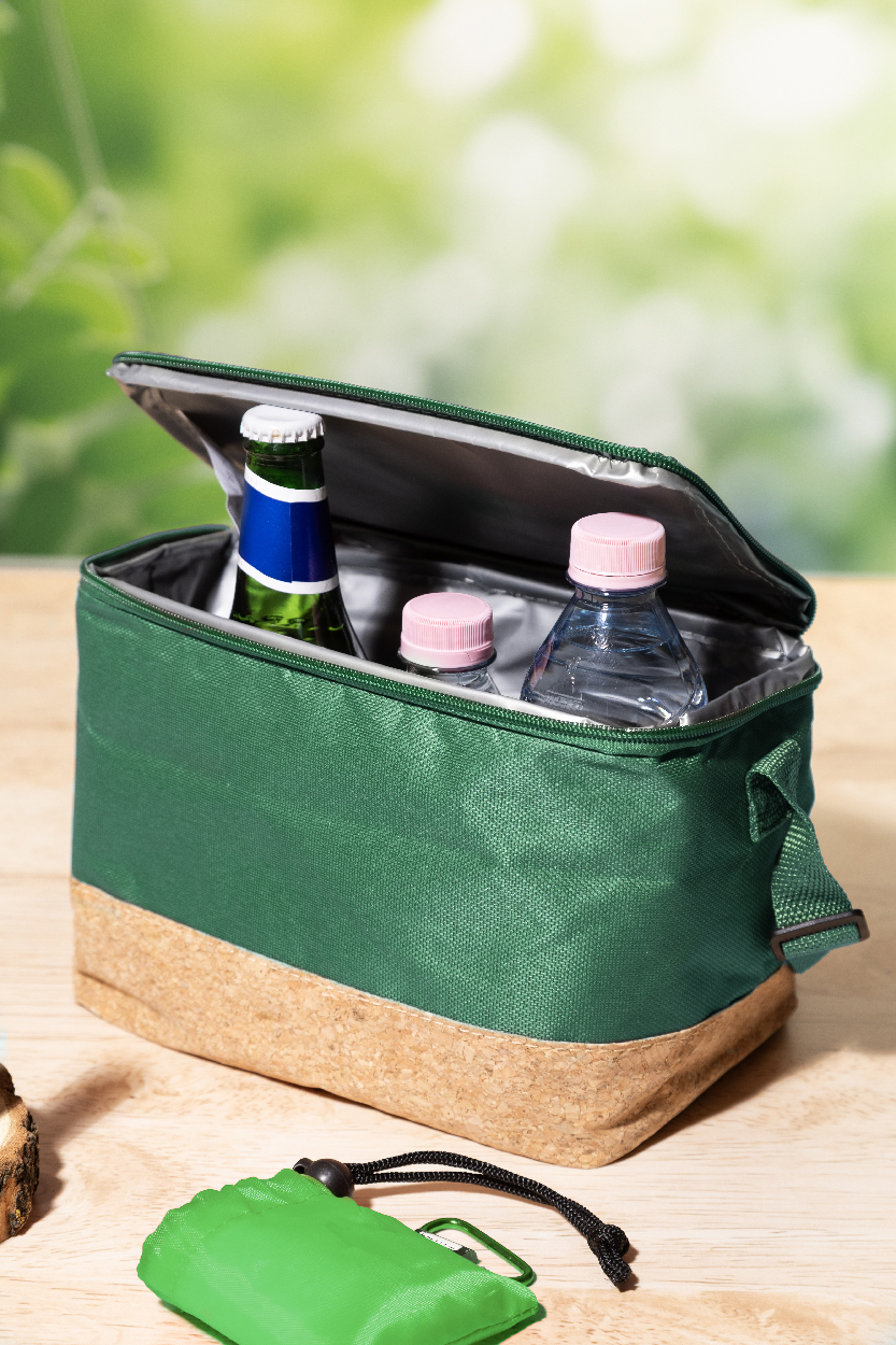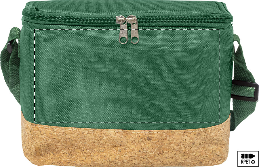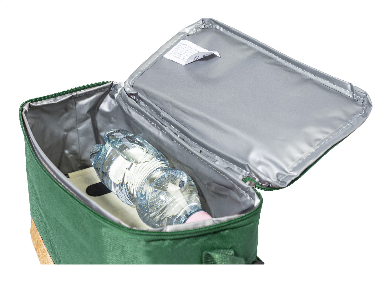 Chladicí taška na zip z 600D RPET polyesteru s přírodní korkovou základnou, PEVA polstrováním a nastavitelným ramenním popruhem. S výrazným štítkem RPET.