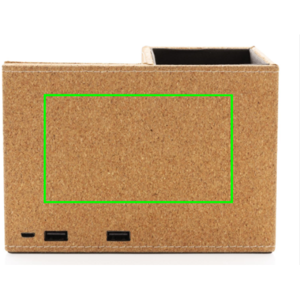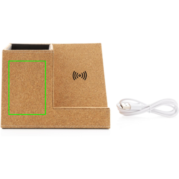 Stojánek na pera a na telefon s 5W bezdrátovou nabíječkou vyrobený z přírodního korku. Včetně 1,5m microUSB nabíjecího kabelu z kombinace pšeničné slámy (15 %) a TPE. Bezdrátové nabíjení je kompatibilní se všemi zařízeními podporujícími Qi, jako jsou nejnovější zařízení s Android a iPhone 8 a výše. Na zadní straně disponuje dodatečnými 2 USB A výstupy pro nabíjení pomocí kabelu. Vstup: 5V/2A. Bezdrátový výstup: 5V/1A 5W, 2x USB A výstup: 5V/2A. Produkt a příslušenství bez obsahu PVC.