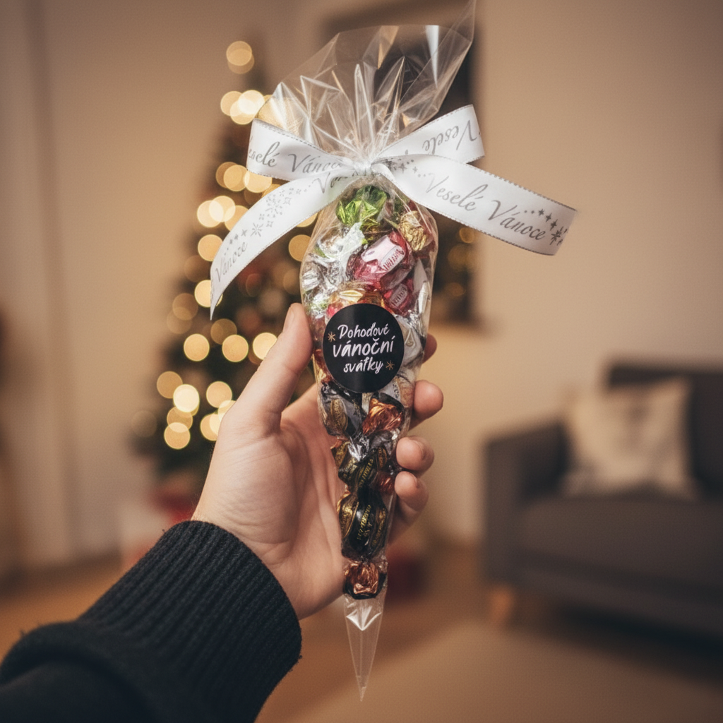 Elegantní drobný dárek „ready to give“ pro klienty, zaměstnance i soukromé akce. Mix pralinek balíme do celofánového kornoutu se sváteční mašlí. Přidáme vaši samolepku nebo komplimentku (logo, přání, motiv kampaně); grafiku zkontrolujeme a pošleme náhled ke schválení. Značka Dárkovna, vyrobeno v Česku.