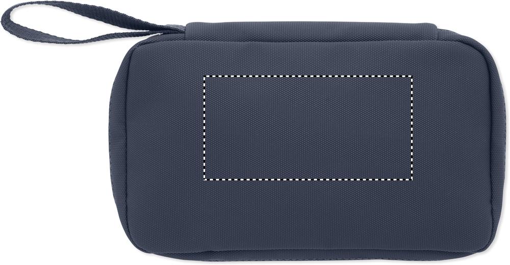 Toaletní taštička z 600D RPET s PU zátěrem, síťovinou RPET a podšívkou 210D RPET. Hlavní kapsa na zip vpředu, vnitřní síťovina a otevřené kapsy.