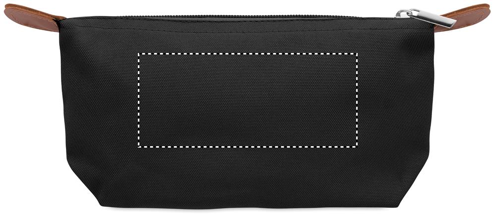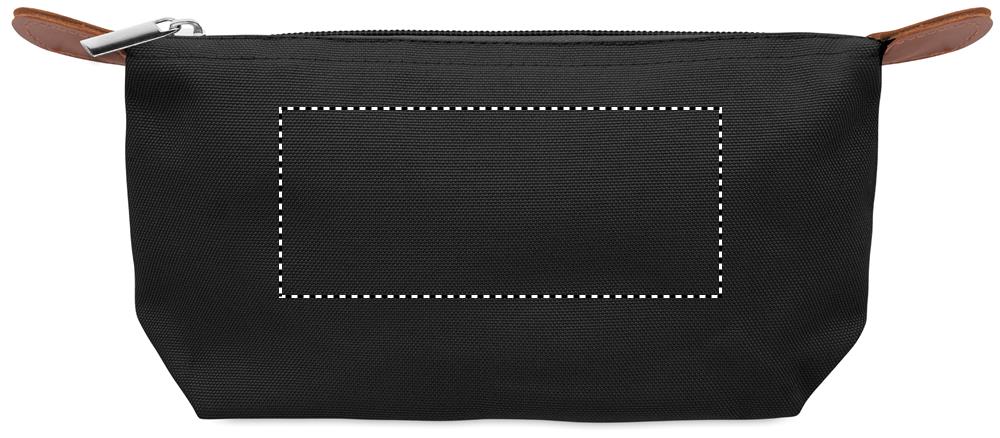 Kosmetická taštička z polyesteru 600D RPET s horním zapínáním na zip a hnědým PU detailem.