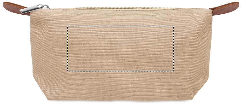 Kosmetická taštička z polyesteru 600D RPET s horním zapínáním na zip a hnědým PU detailem.