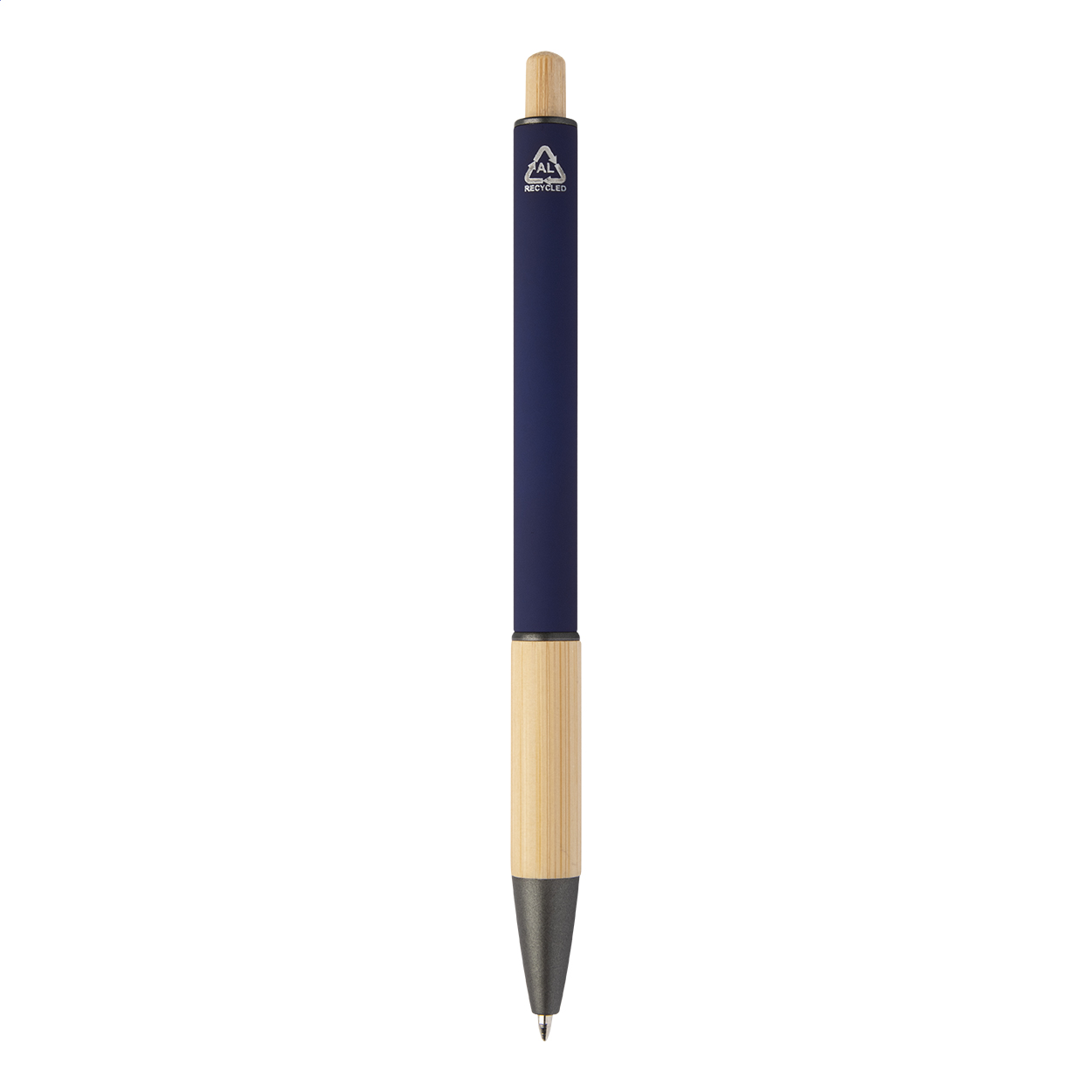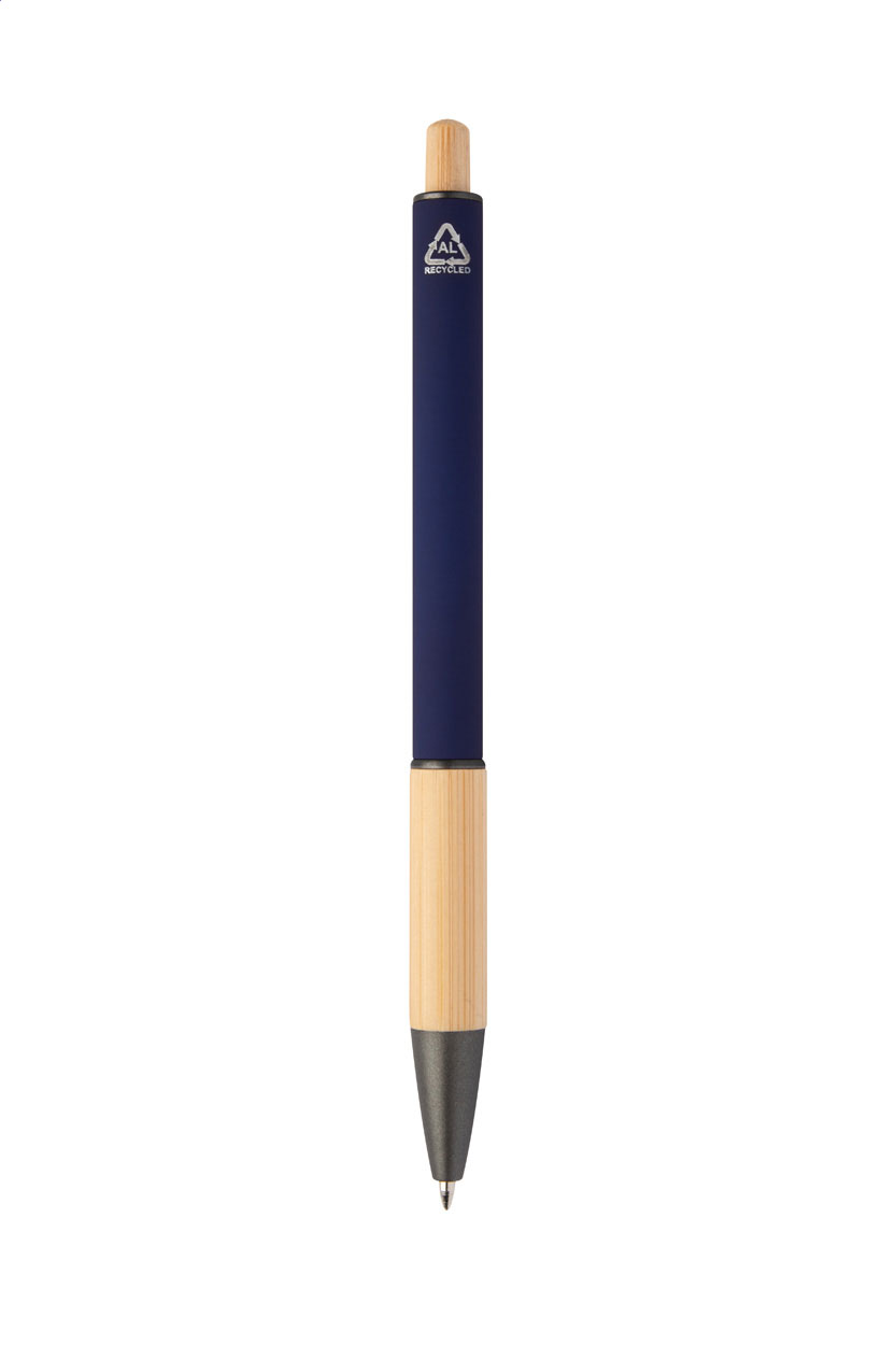 Kuličkové pero z recyklovaného hliníku s bambusovým úchopem a tlačítkem, pogumovaným tělem a kovovými částmi. S modrou náplní.